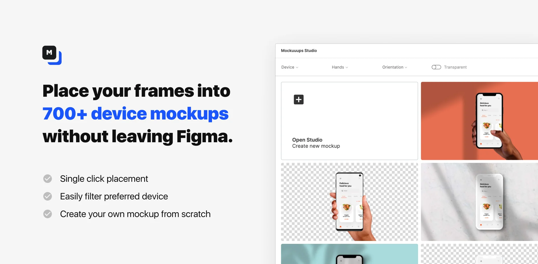 Es muy simple de utilizar, unicamente tendrás que seleccionar un frame y Mockuuups Studio se encarga del resto. Este insertará y escalará automáticamente el marco seleccionado en multitud de vistas previas, con la finalidad de poder escoger tu favorito, pudiendo exportar la maqueta como archivo o si lo prefieres poder colocarla directamente en el documento.