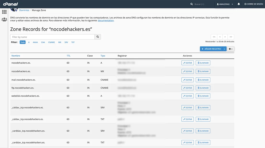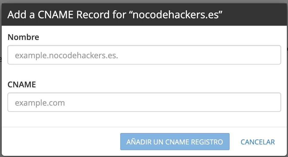 De la misma manera, deberás buscar todos los campos que tengan valor CNAME y como nombre www.nocodehackers.es (Sustituye eso por el nombre de tu dominio).