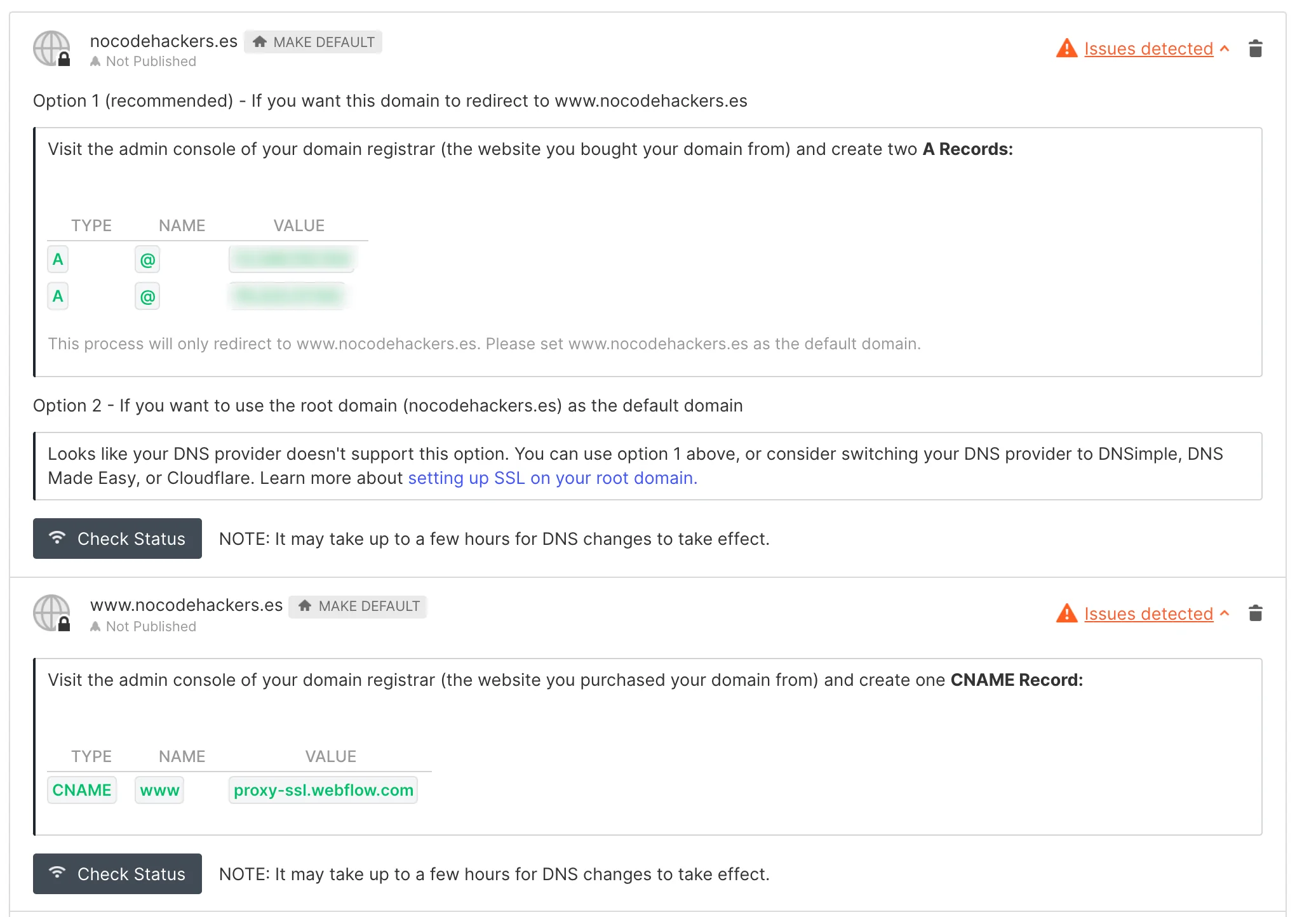 Webflow pide que añadas dos campos A al dominio, así como un campo CNAME. Esto es lo que le indica al dominio que apunte a tu proyecto de Webflow.