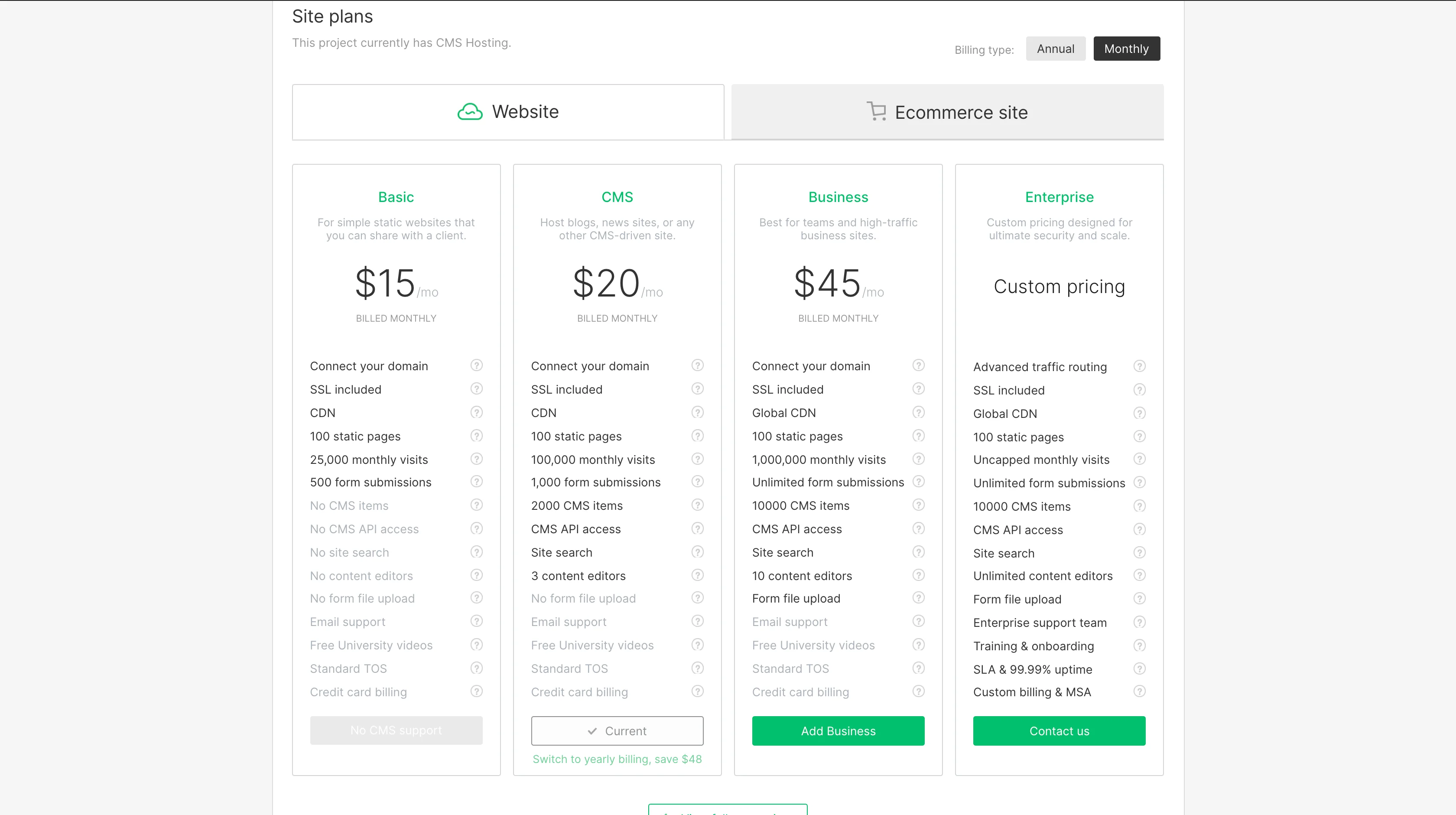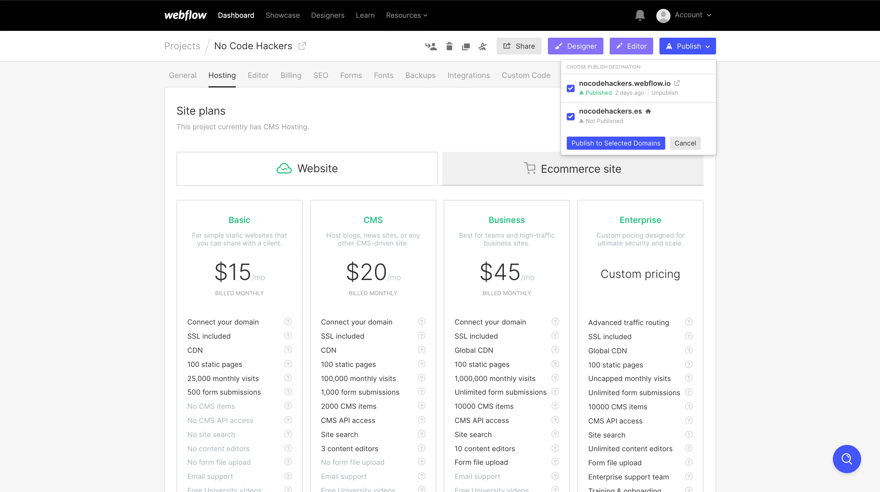 Lo primero que deberemos hacer es comprar un plan para el sitio: https://webflow.com/pricing y elegir uno de los planes de sitio que nos ofrecen. En mi caso, voy a escoger el Plan mensual con acceso al CMS, debido a que voy a alojar un blog dentro de Nocodehackers, y el CMS permite hacerlo de manera realmente sencilla, además de ser una pieza clave en muchos otros aspectos.
