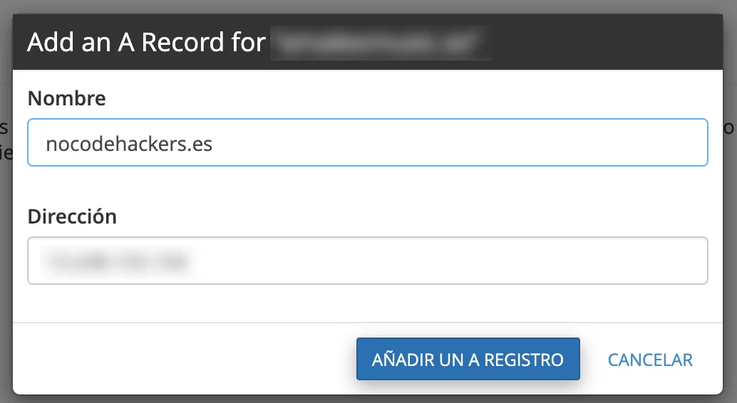 Nombre: nocodehackers.es, Tipo: A, Registrar: XXX.XXX.XX.XX