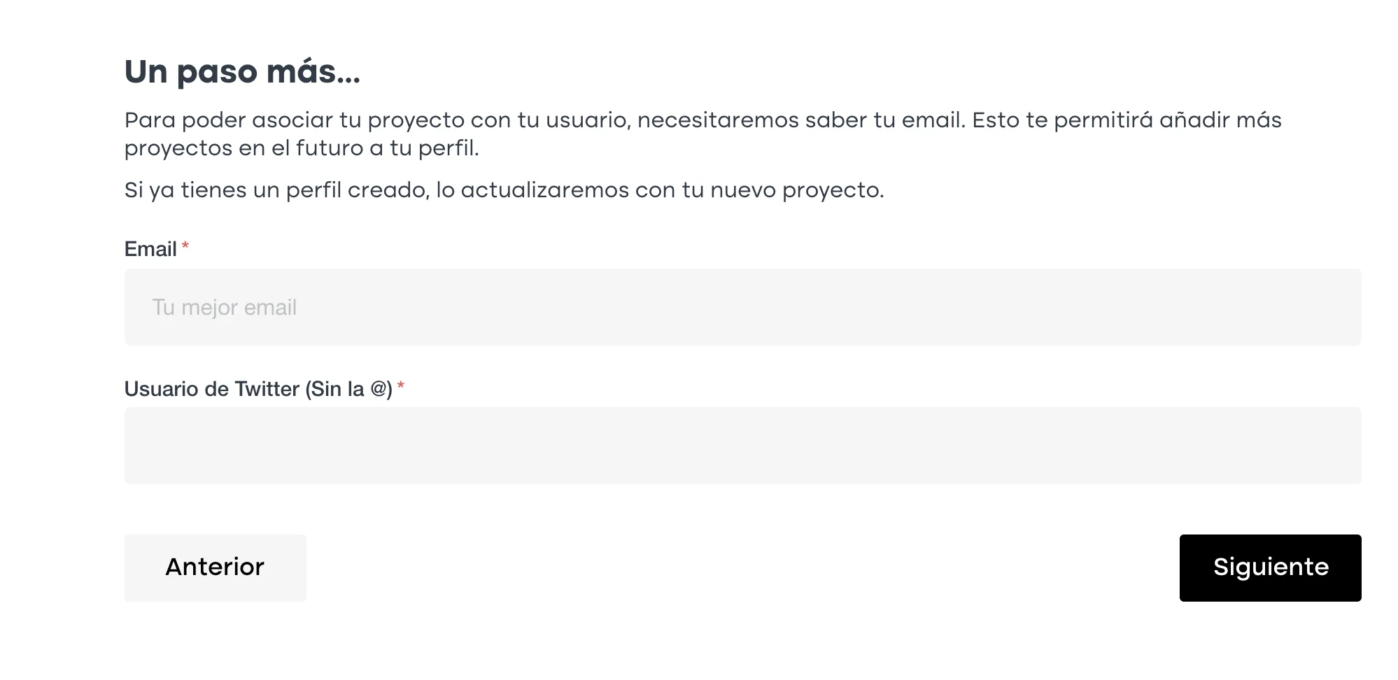 Si queremos tener un producto que sea sencillo de usar y que la gente pueda subir sus proyectos sin fricción, el proceso de subida tiene que ser lo más sencillo posible, y eso pasa por pedir la menor cantidad de datos posible.