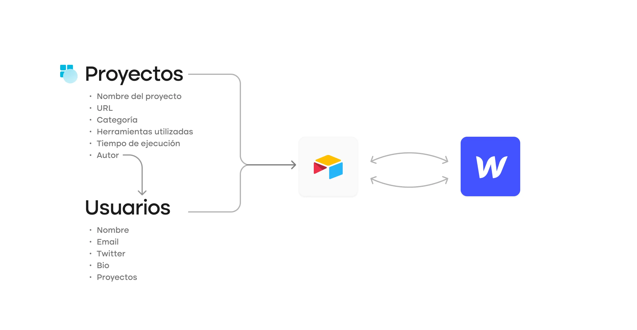 Los proyectos cuentan con dos tipos de datos: Los datos relativos al proyecto en si, pero además la información acerca del usuario (Nombre, foto de perfil, etc...). Y nos encontrábamos con el problema de que actualmente no se pueden crear cuentas de usuario en Webflow y que queríamos evitar tener que hacer que se crearan otra cuenta en un nuevo servicio.