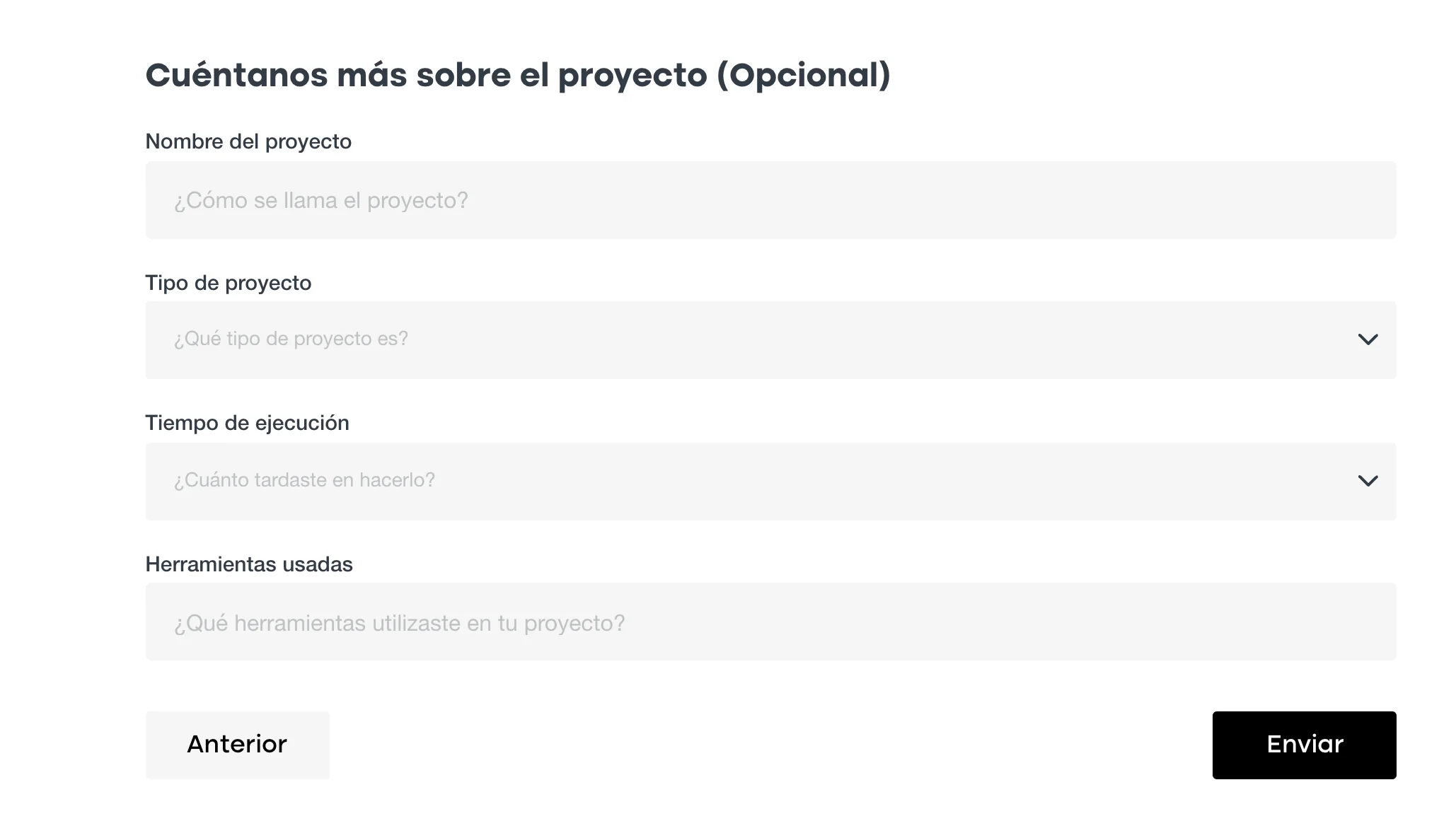 Una vez que sabemos cuál es el proyecto y quién lo sube, le pedimos información adicional que nos enriquecerá el proyecto - pero que no es obligatoria, como el nombre del proyecto, duración, herramientas, etc...