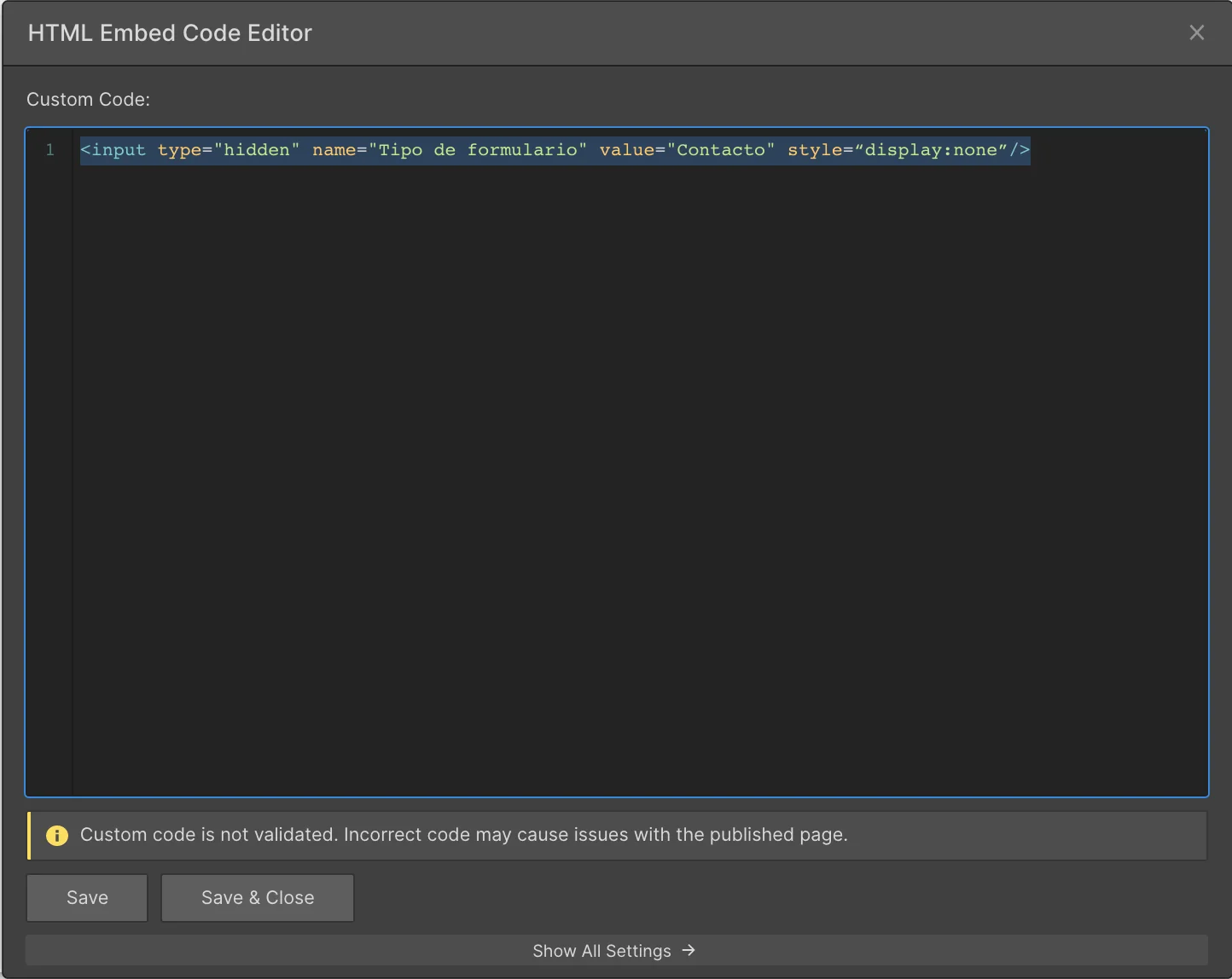 <input type="hidden" name="Tipo de formulario" value="Contacto" style=“display:none”/>