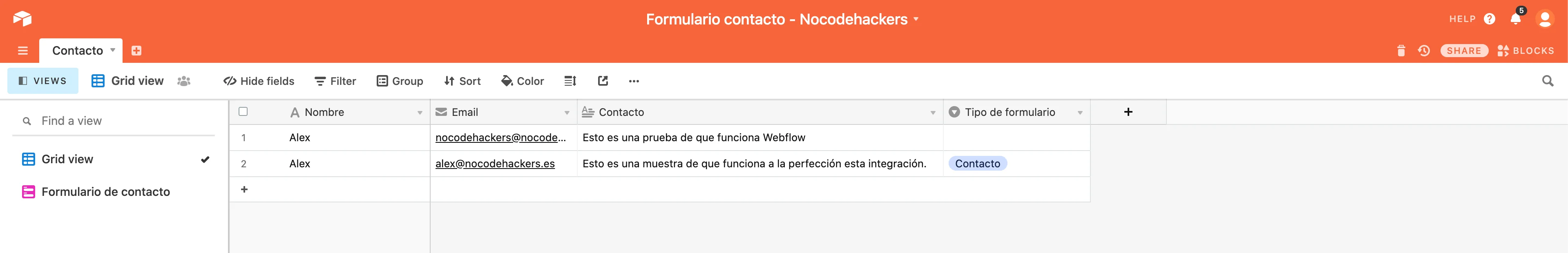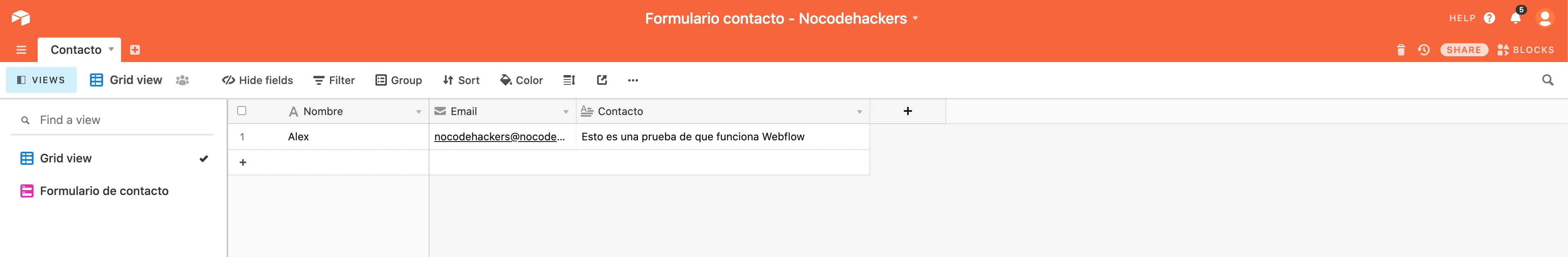 A partir de ahora, cada formulario que se envíe en Webflow, te llegará a tu Airtable (En función de tu plan variará la frecuencia con la que esto sucede).