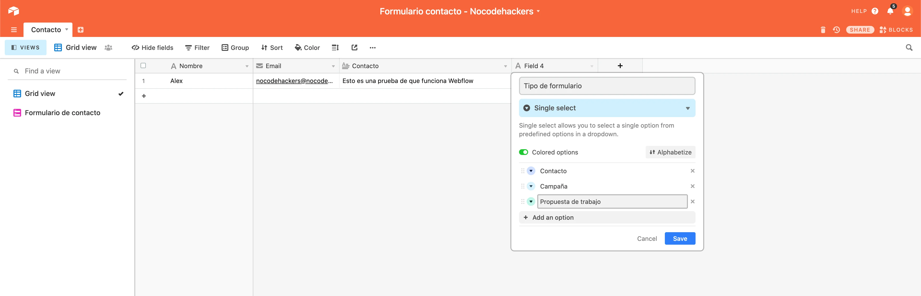 En este caso, lo que vamos a aprovechar es para que sepamos de qué formulario nos ha venido el "lead" en el caso de que tengamos varios formularios en la web. Es por eso que vamos a crear un campo del tipo "Single Select" y que incluya todas las posibilidades de formularios: Contacto, Campaña o Propuesta de trabajo (Por ejemplo)
