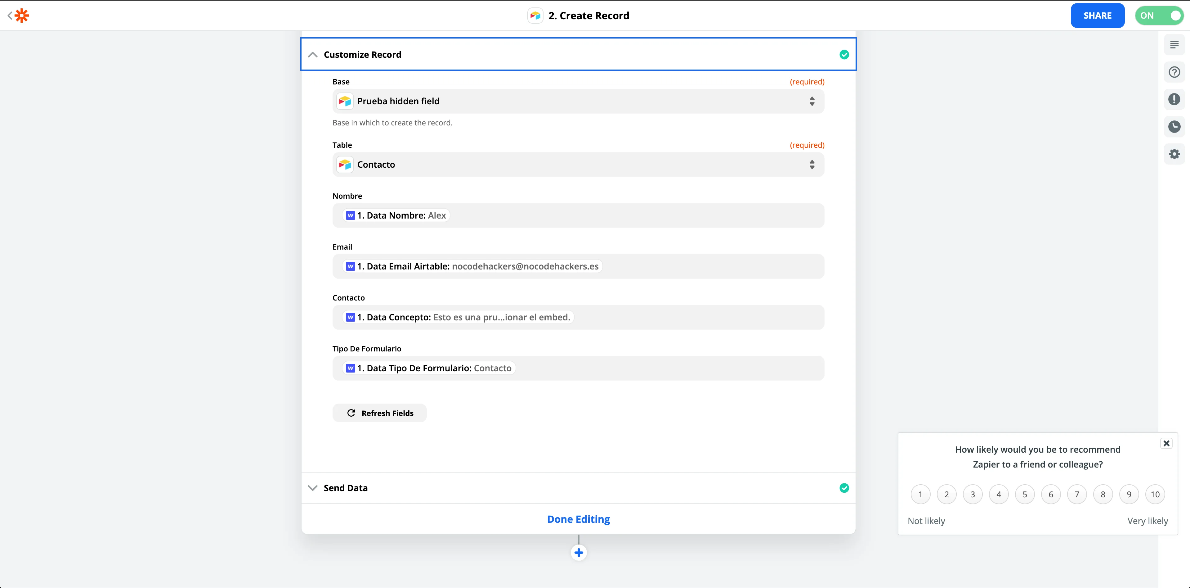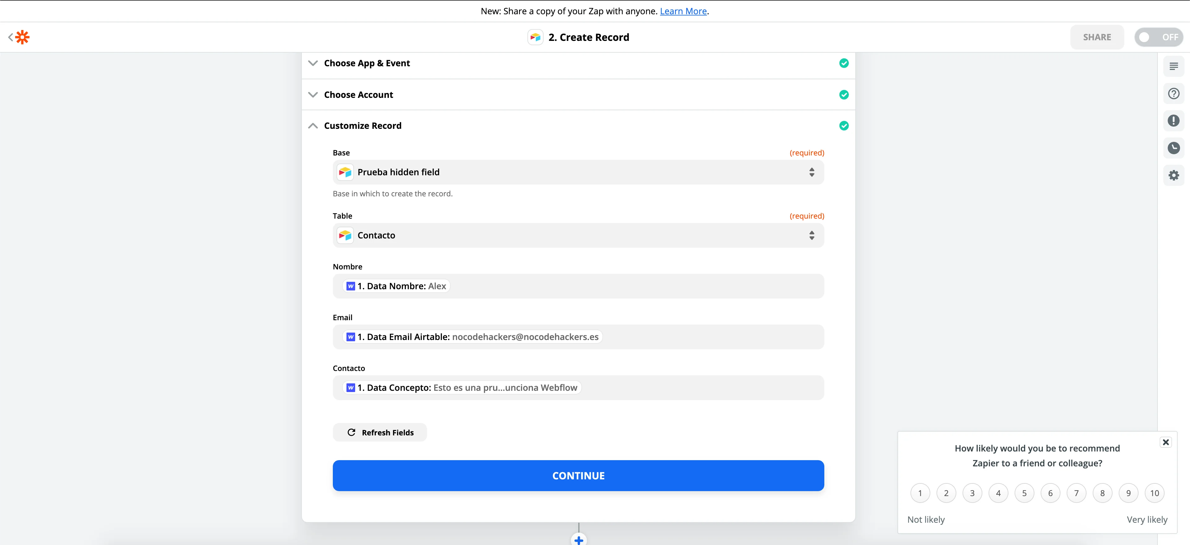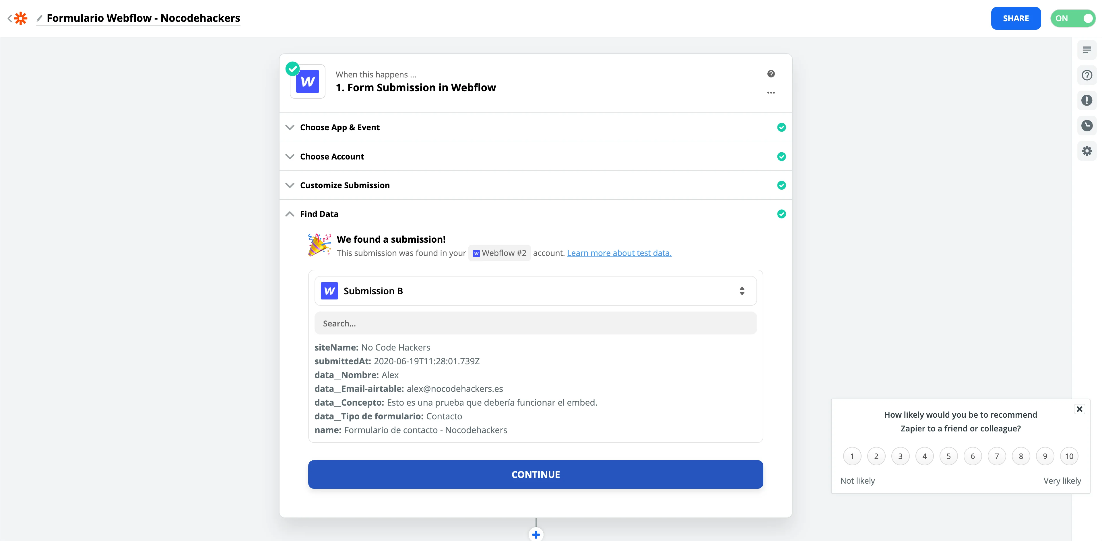 Ahora le daremos a continuar, y automáticamente hará un test de que funciona la conexión, para ello veremos en nuestra conexión de Airtable que aparece el formulario que hemos enviado antes.