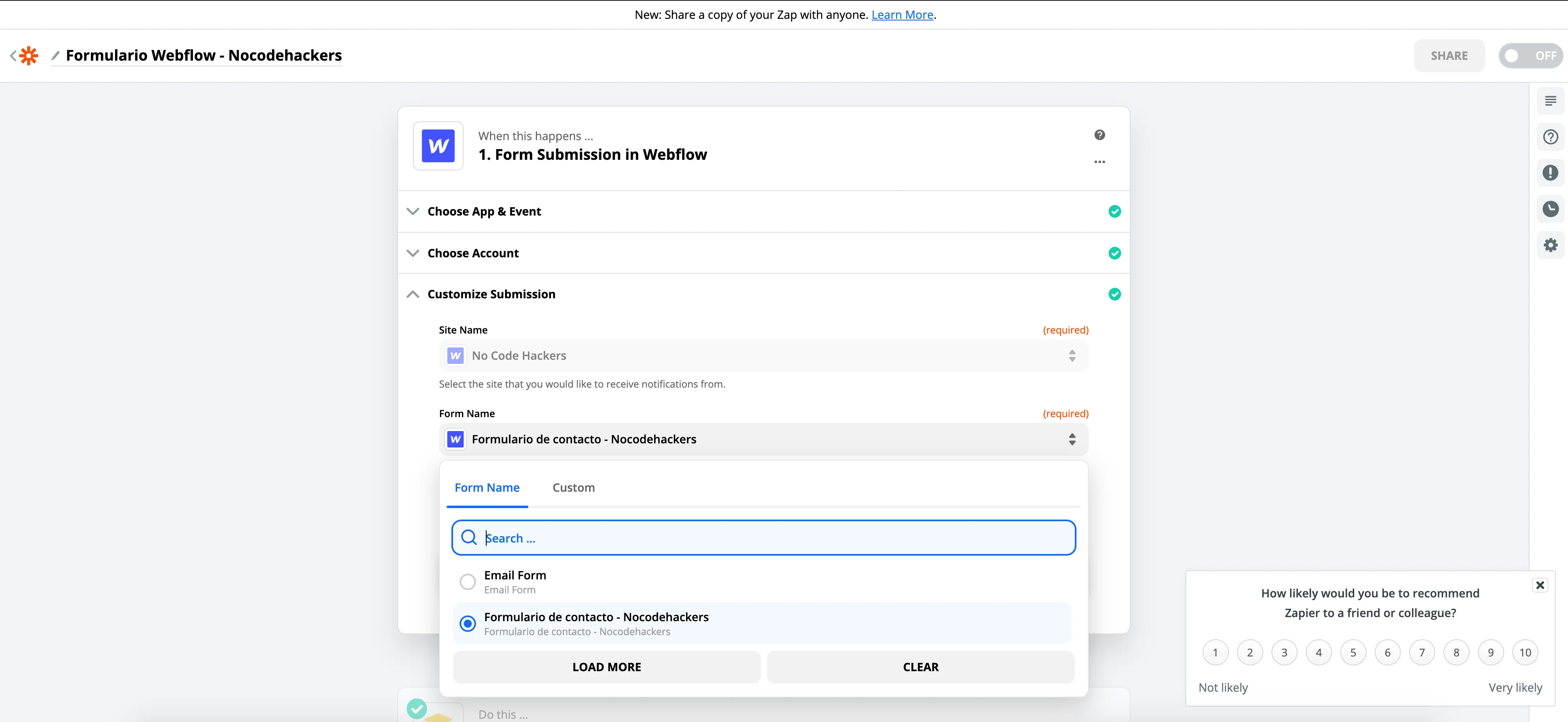 Para que funcione y Zapier lo reconozca, debemos hacer un envío en la página publicada. (Si no no lo detectará).