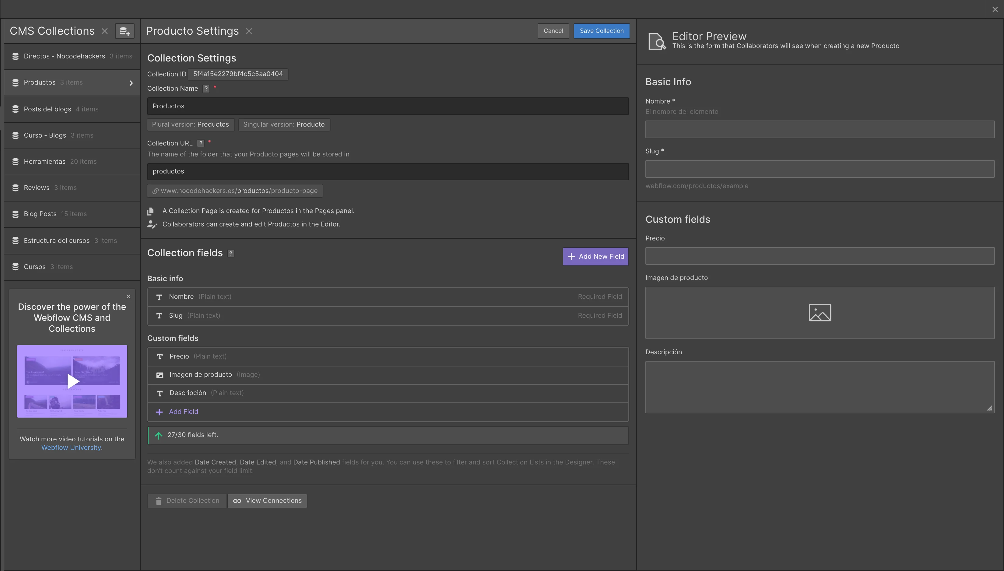 Vamos a tener que crear una Collection en el CMS de Webflow que contenga todos los productos que queremos vender en nuestra web.