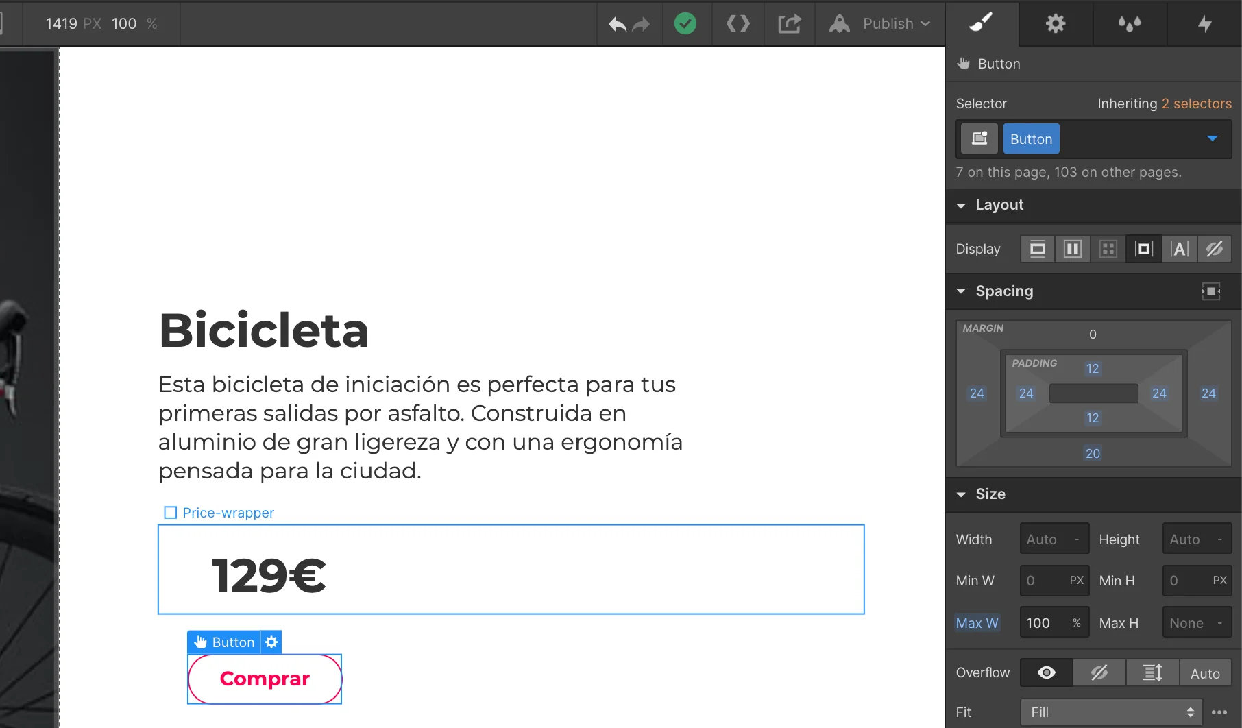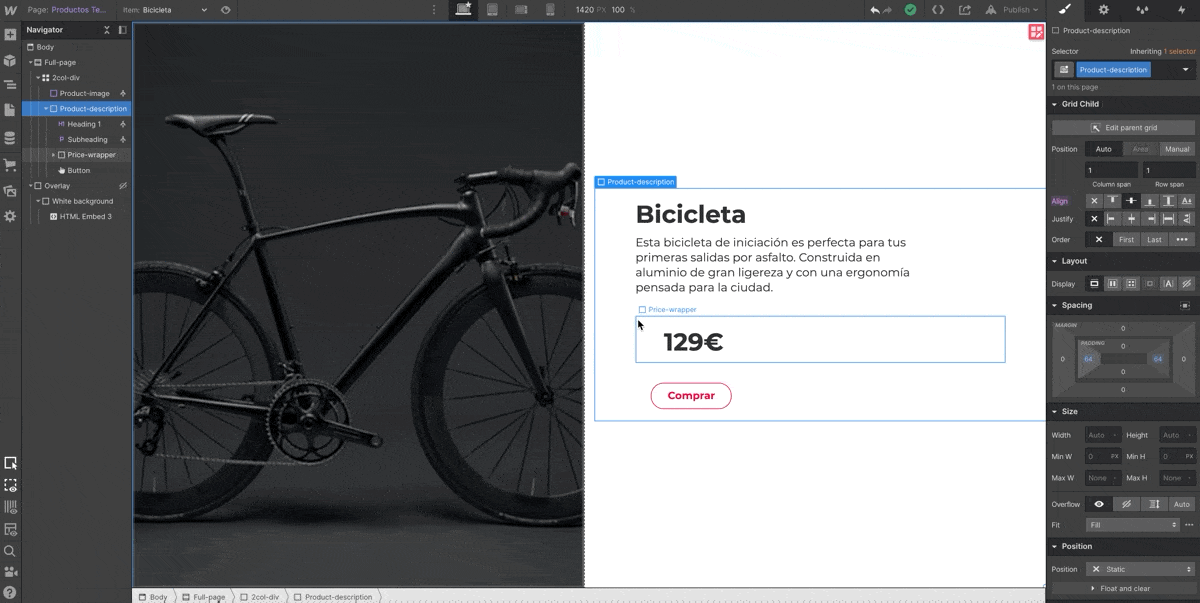 Ahora, es el momento de crear en Webflow una manera de mostrar los productos. Yo en este caso para ilustrar el concepto he hecho una página simple en la que se muestran los productos, el precio y que una vez que entres en el producto tengas una descripción del producto.