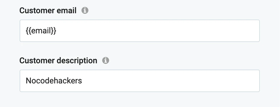 - Después, puedes configurar campos como Customer Description y Email, para configurar el cliente que generarás dentro de Stripe.