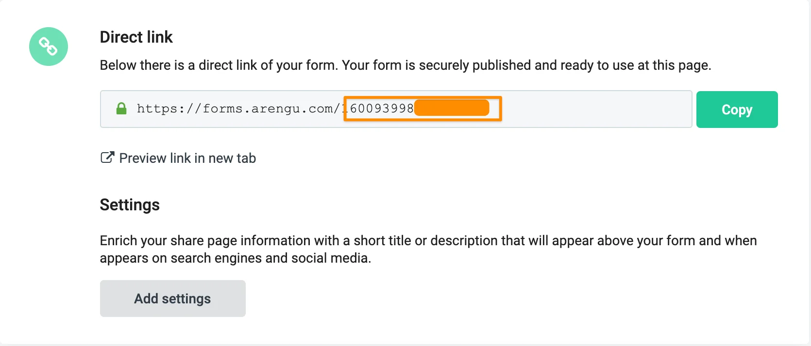 Deberás sustituir el apartado de AQUIVATUFORMID - por el ID de tu formulario , que puedes obtener desde la página de compartir de Arengu.