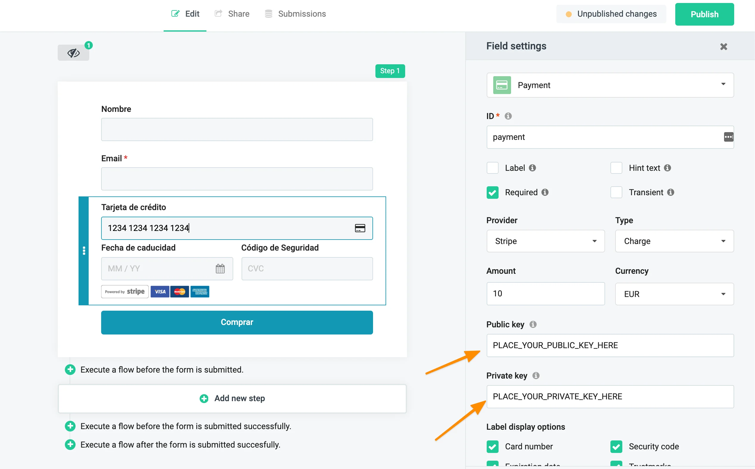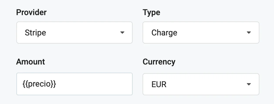 Ahora que stripe ya está configurado, puedes configurar todos los campos que quieras, pero lo que nos falta por hacer es que el campo de Amount (Cantidad) sea variable en función del producto que estemos vendiendo.