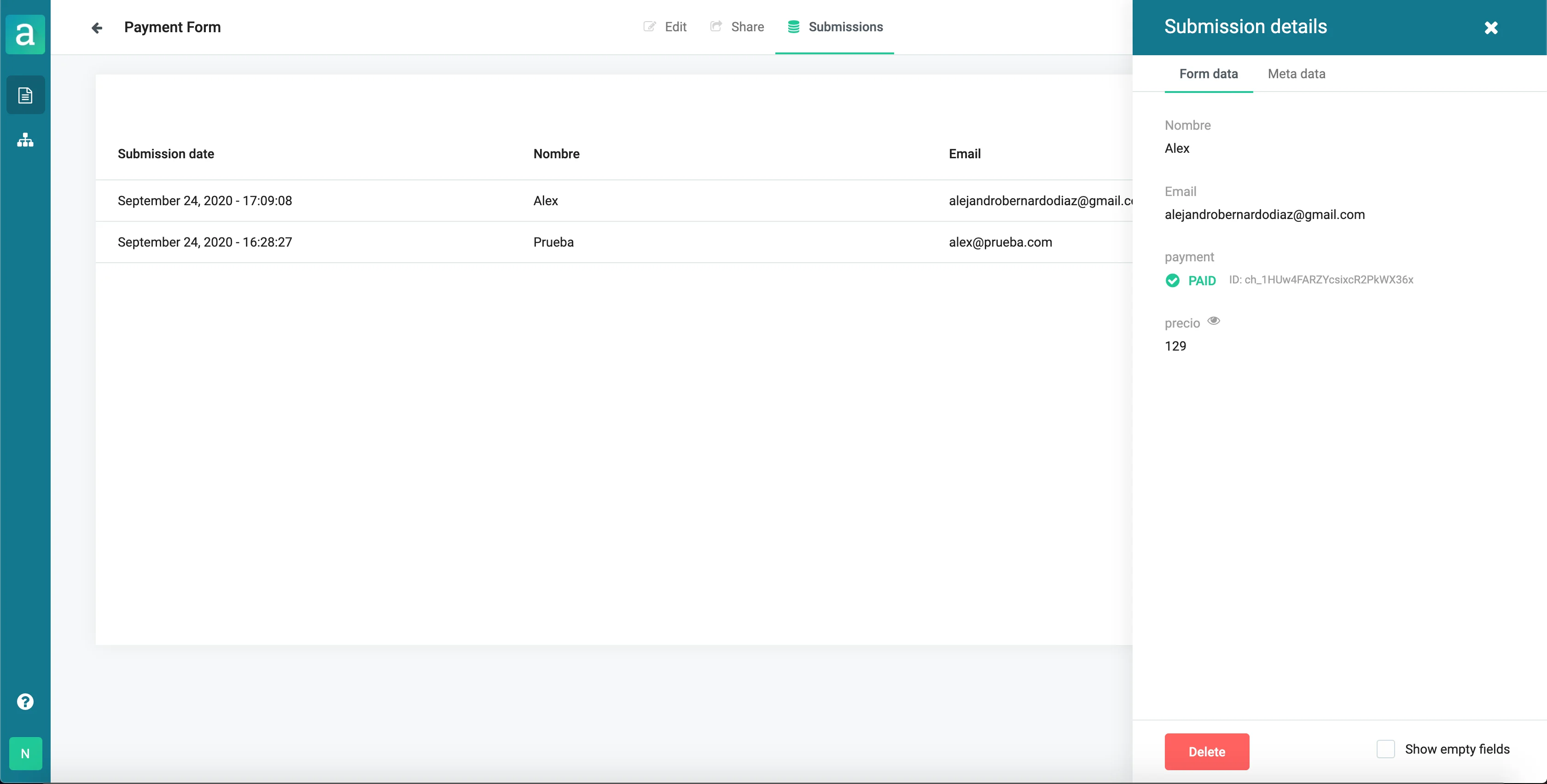 Si ahora vas a Arengu a la pestaña de submissions, podrás ver todos los detalles de la transacción - incluyendo el precio, y el estado del pago. También en tu dashboard de Stripe te aparecerán los mismos datos de pago.