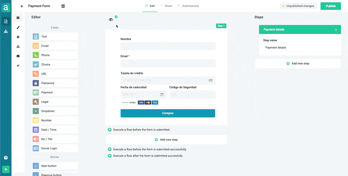 Simplemente tienes que hacer click en el módulo de pagos del formulario, y tendrás todas las opciones de configuración de esta pasarela.