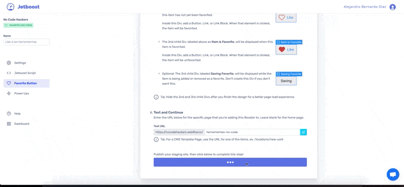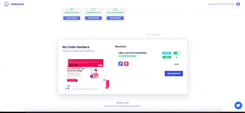 Las diferentes funcionalidades en Jetboost, se llaman "boosts" y debes añadir un sitio, dándole acceso a tu cuenta de Webflow. El proceso de autorización es muy sencillo, simplemente accede con tus credenciales de Webflow y estará listo.