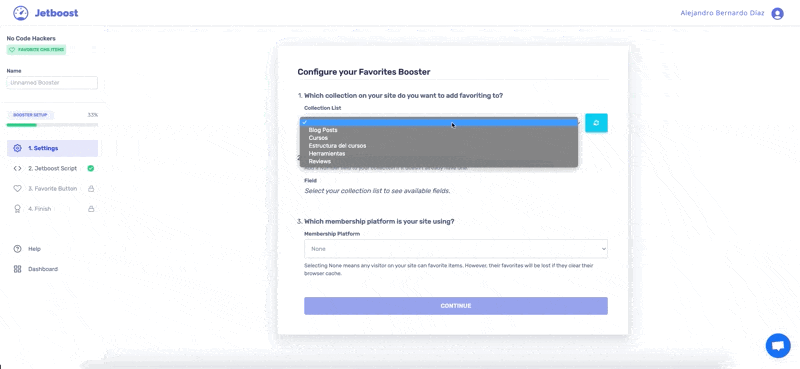 Te pedirá ahora que selecciones una Collection List de las que tienes creadas en tu sitio web - debes crearla antes de empezar.