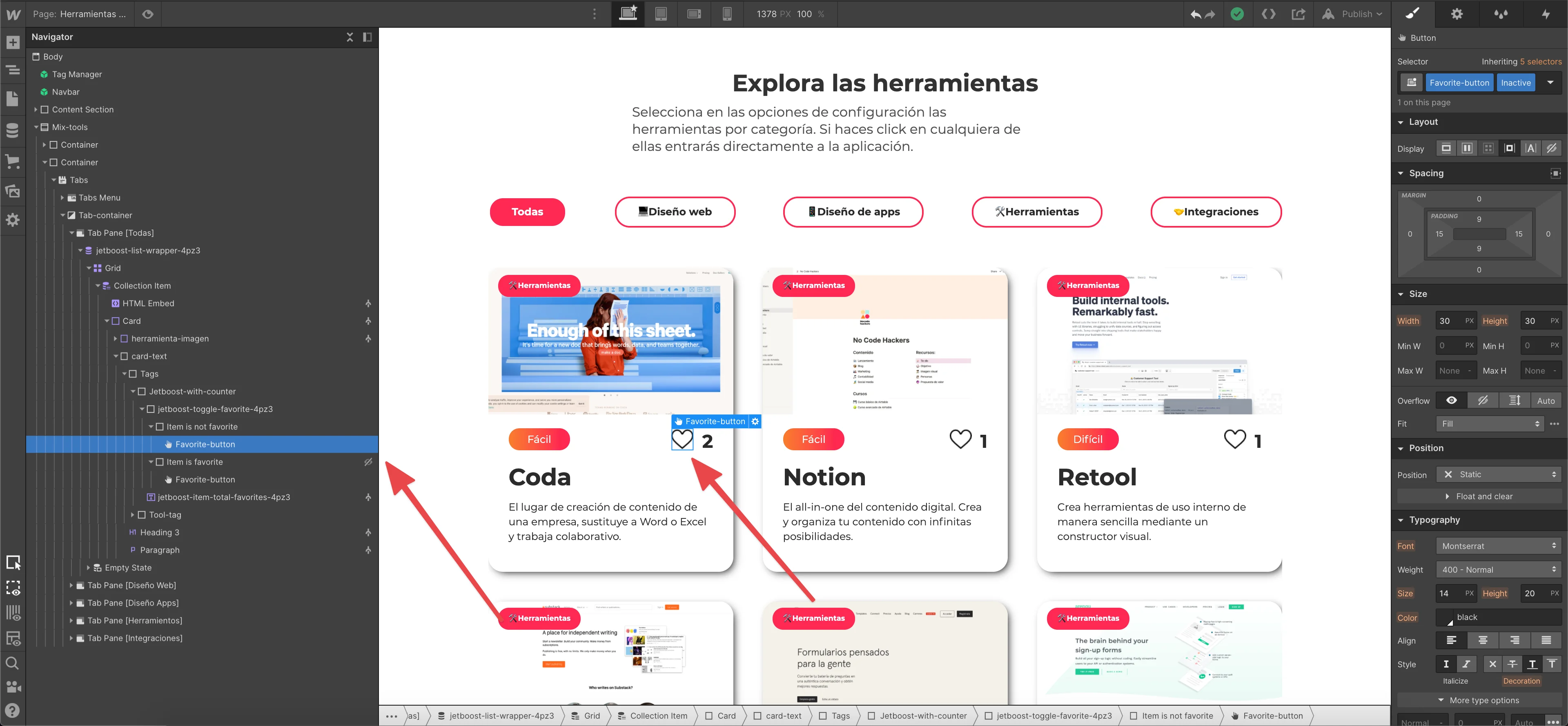 Podemos configurar ahora como queramos el elemento que activará la función de favoritos, el único requisito es que sea un Button, un Link o un Link Block.