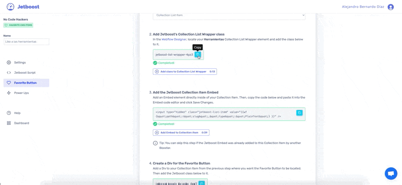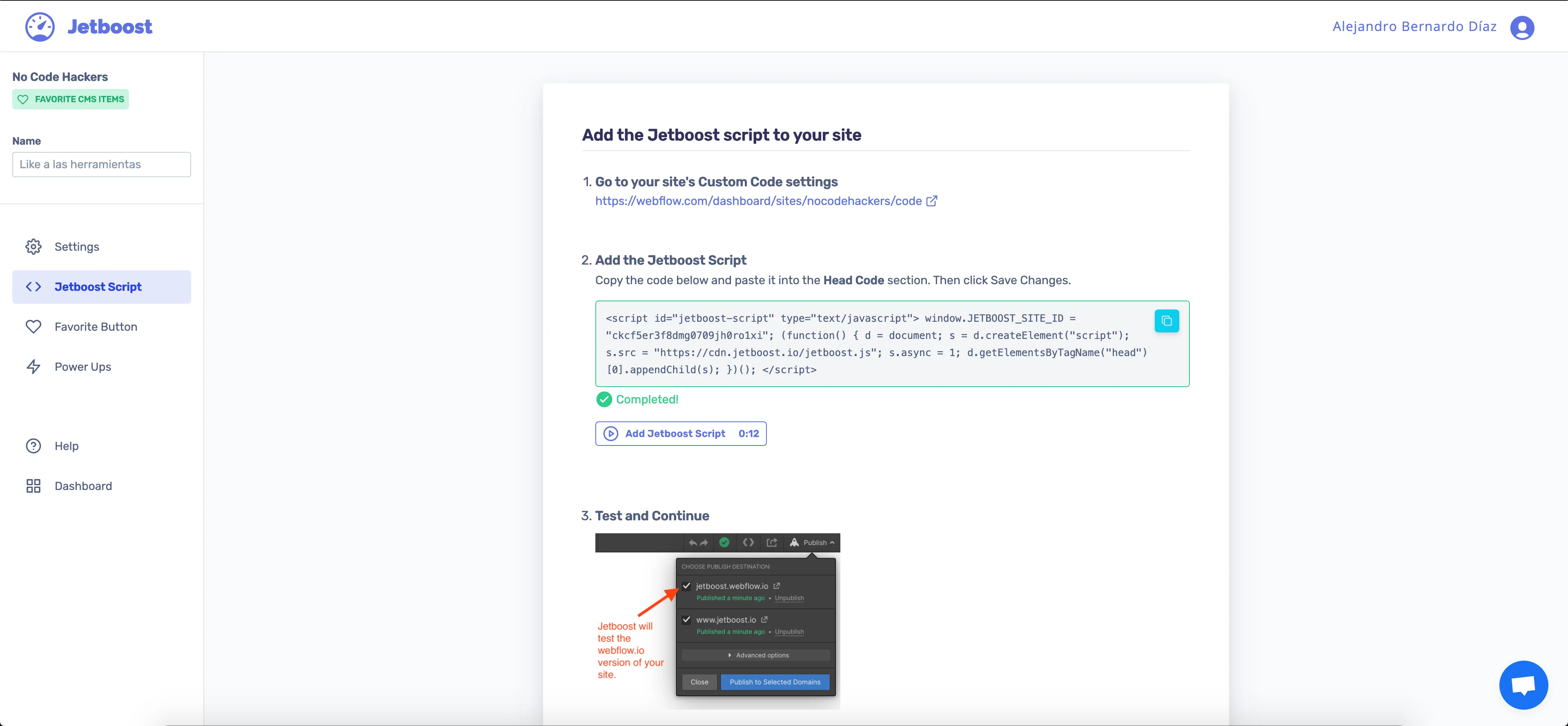 Simplemente pasa al segundo paso, Jetboost Script, copia y pega este código en la sección de código personalizado de tu web.
