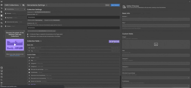 Después, deberás crear en tu Collection List, en Webflow un campo de tipo Number en el que se almacenarán los valores de veces que se ha marcado como favorito cada elemento.