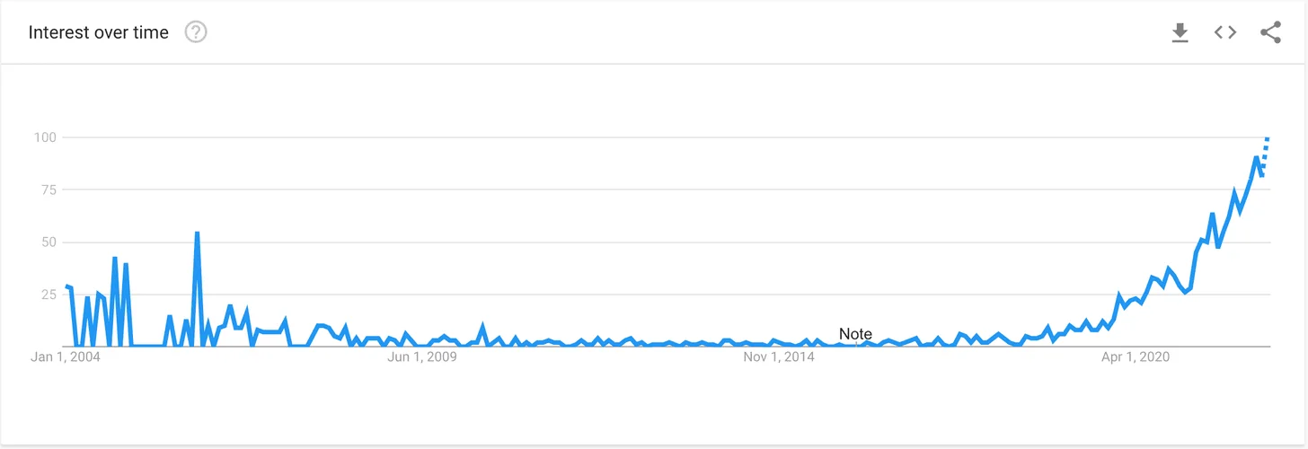 Recientemente se ha vuelto más popular este movimiento, especialmente en el mercado americano. Una búsqueda en Google trends por el término “No Code” nos arroja que su popularidad empezó a crecer a partir del año 2018 - despegando a partir de los años 2019-2020.