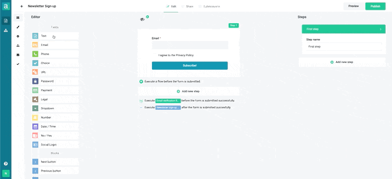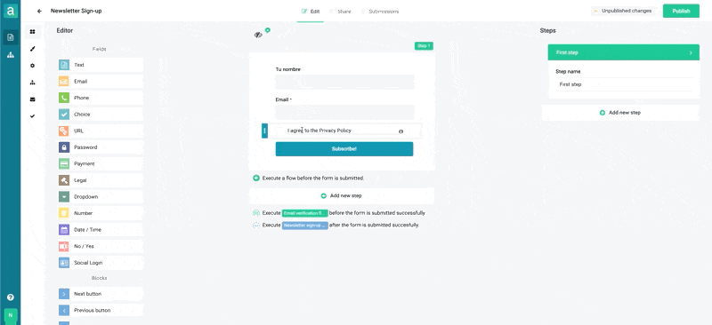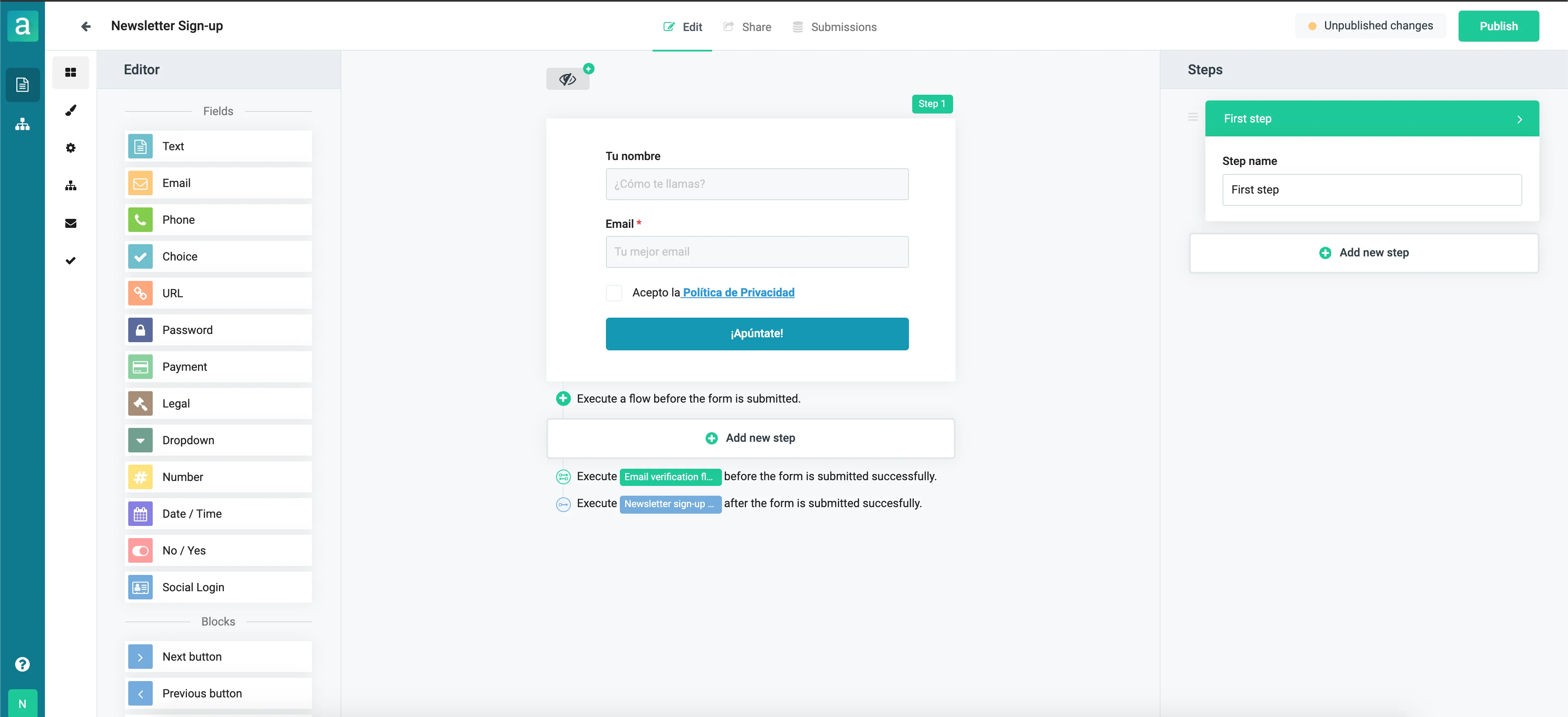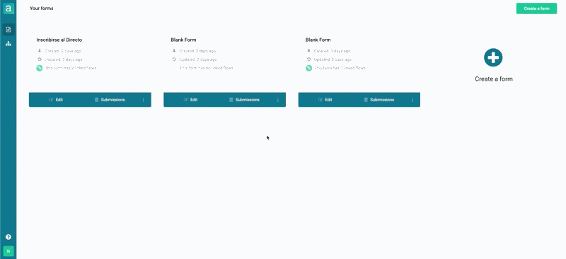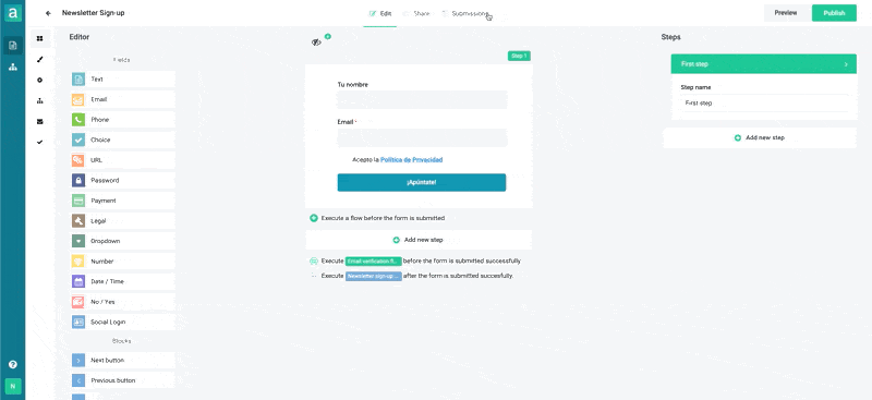 Puedes crear y administrar formularios y crear flujos complejos con integraciones con herramientas de terceros como Pipedrive, Mailchimp, Slack, Telegram... lo que te permite desencadenar una serie de acciones al enviar el formulario (o incluso durante el propio proceso).