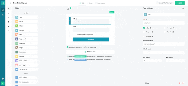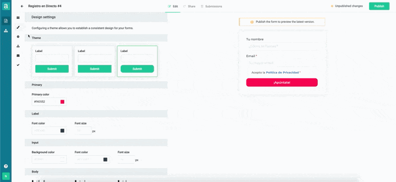 Lo genial de Arengu, que acaban de añadir al producto, es la capacidad de personalizar como se ve el formulario de manera sencilla gracias a su editor visual. Puedes hacer muchos más cambios tocando el CSS, pero para este caso es más que suficiente.