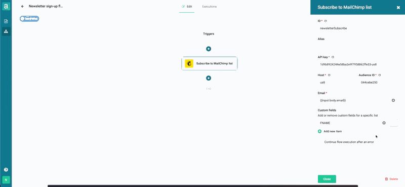 Para ello, simplemente volvemos al flujo, al paso de Suscribe to Mailchimp, y añadimos un campo personalizado.