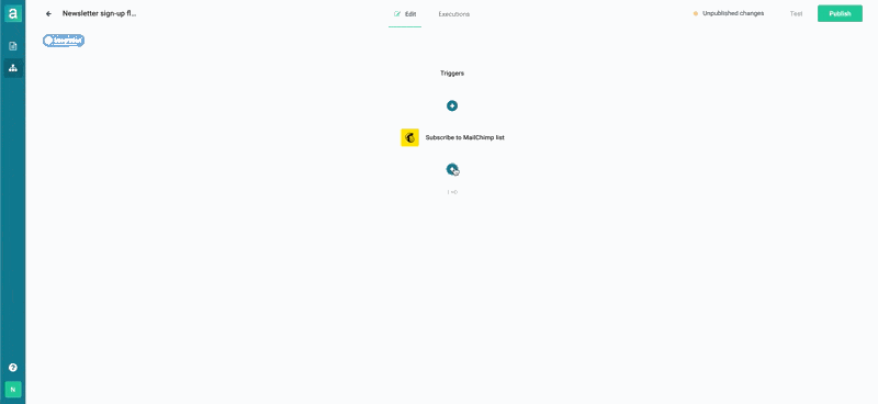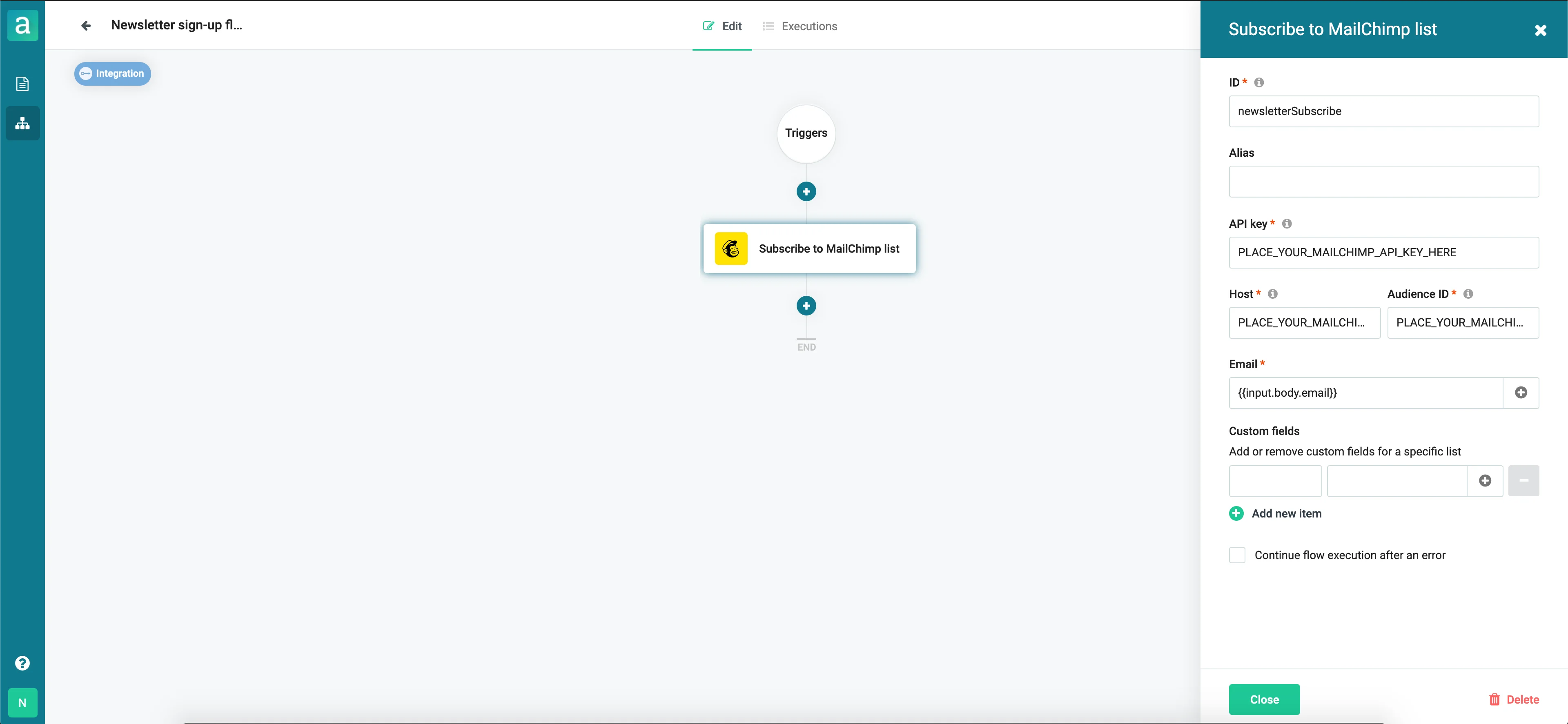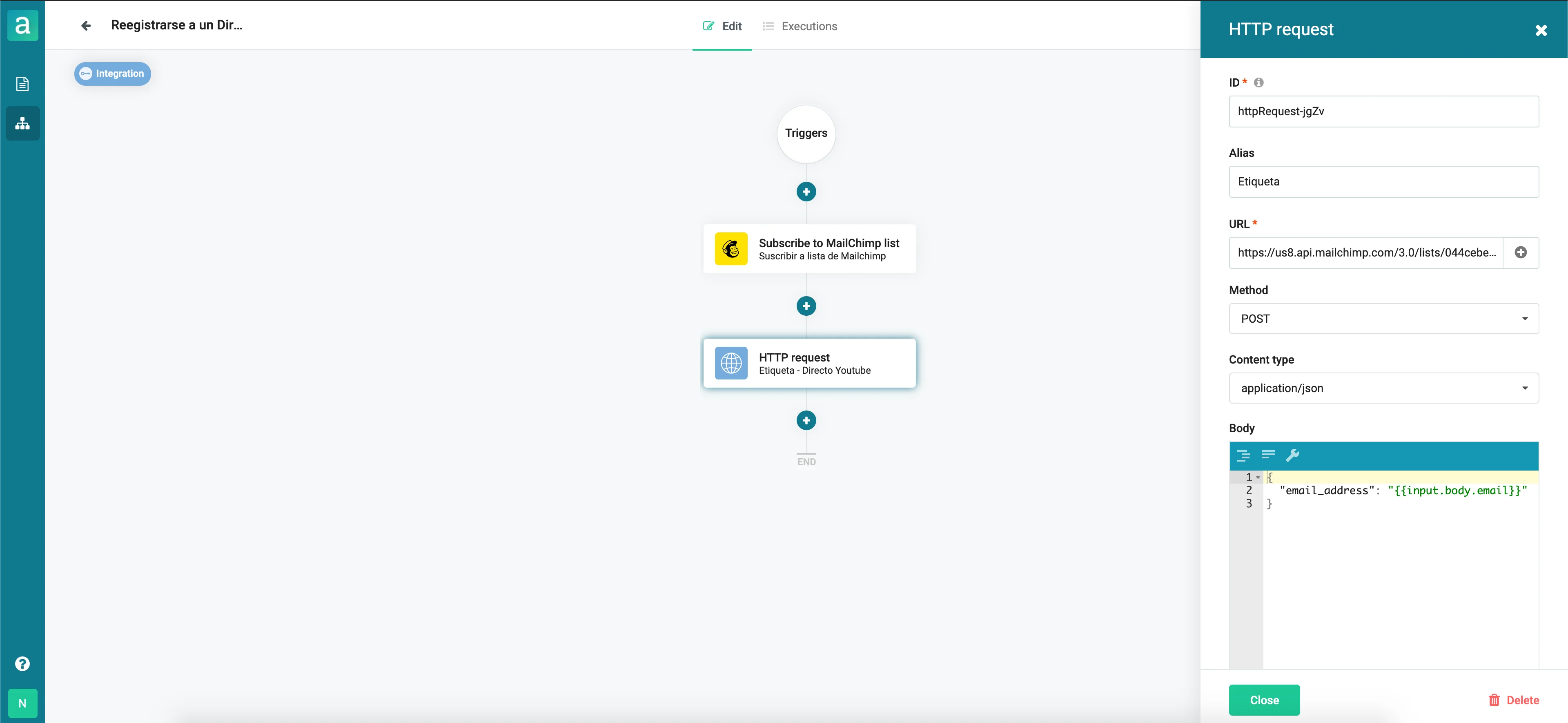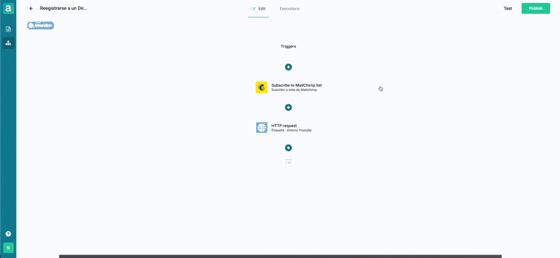 Ya por defecto nos viene un paso que pone "Suscribe to Mailchimp List", así como los pasos que hay que seguir para que funcione correctamente.