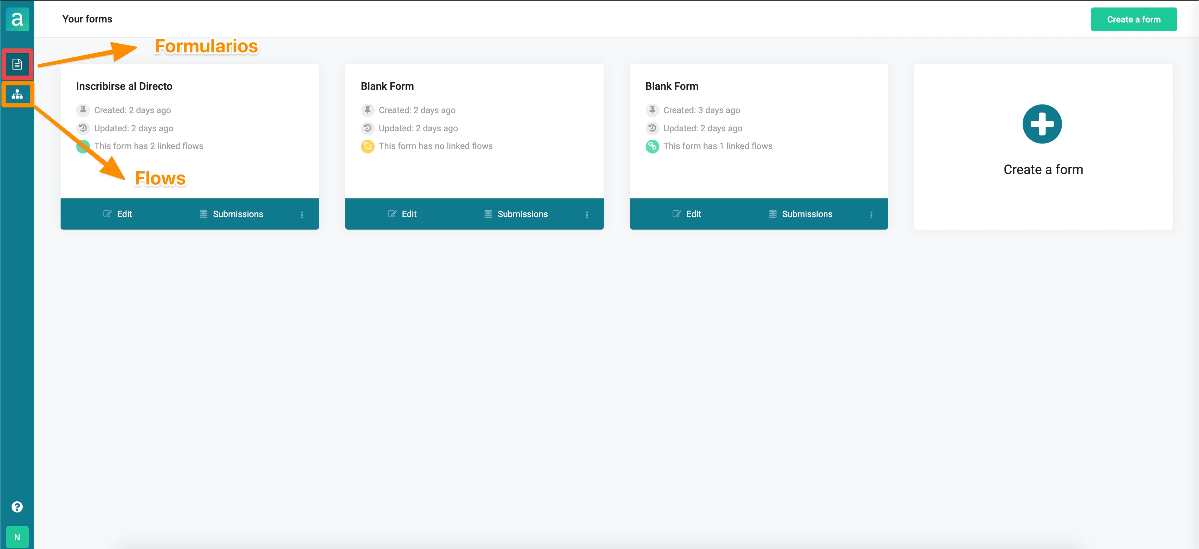 Cabe destacar que en Arengu hay dos elementos que puedes crear, Formularios y Flujos (Flows).