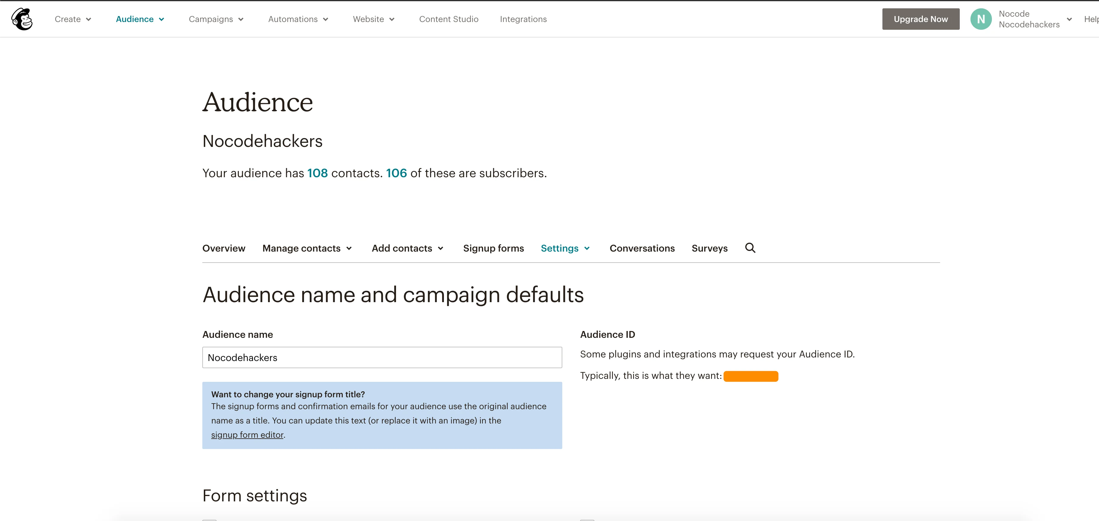 - Audience ID: Simplemente vete a tu audiencia, a los ajustes, Audiencie name and default, y tendrás ahí tu Audience ID.