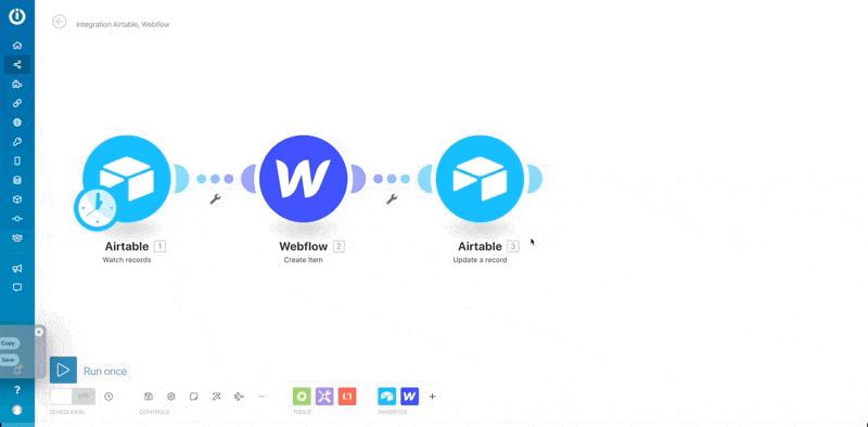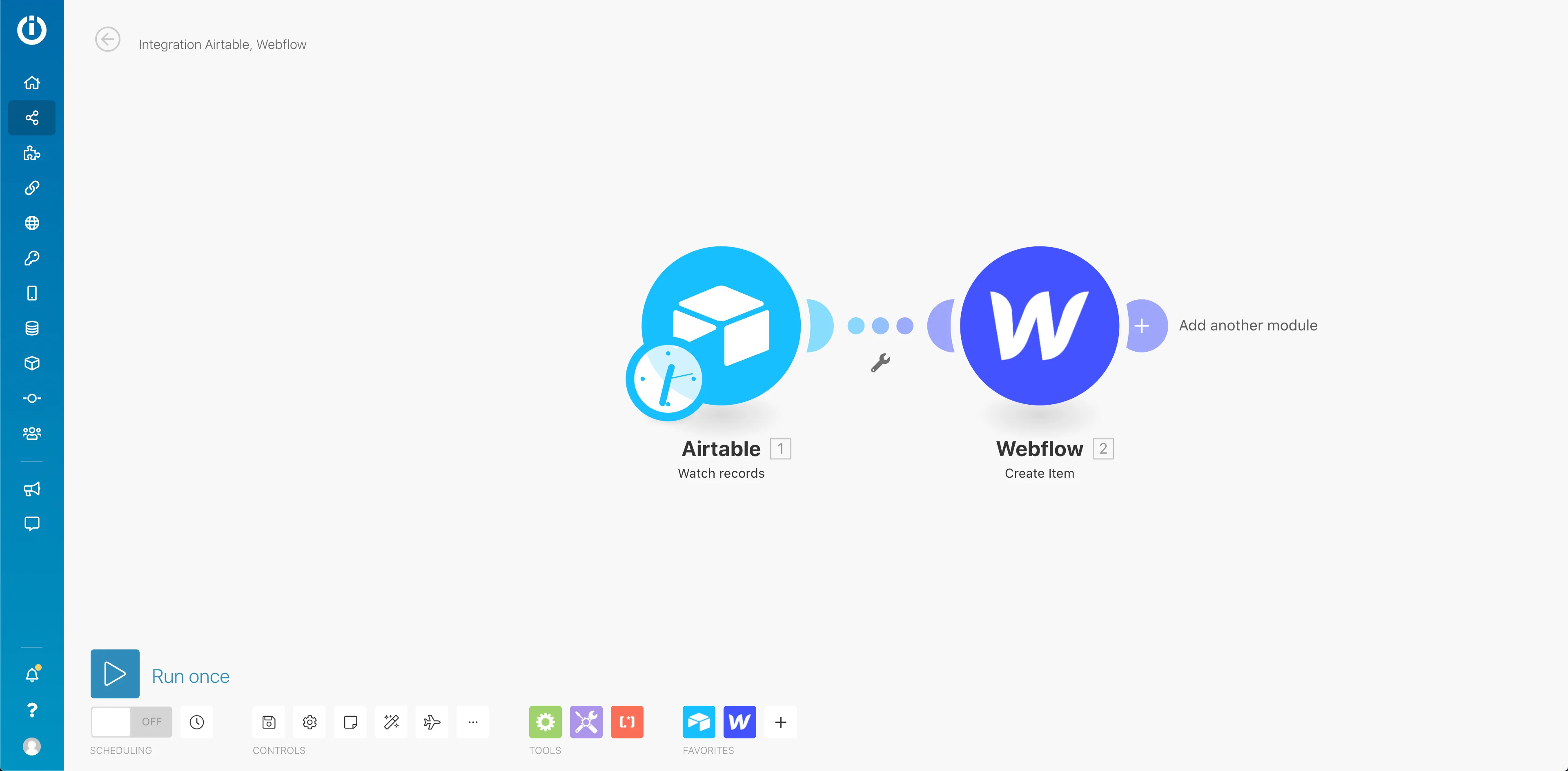 Ahora deberemos crear otra integración en Integromat, que mantenga siempre actualizado nuestro CMS de Webflow.