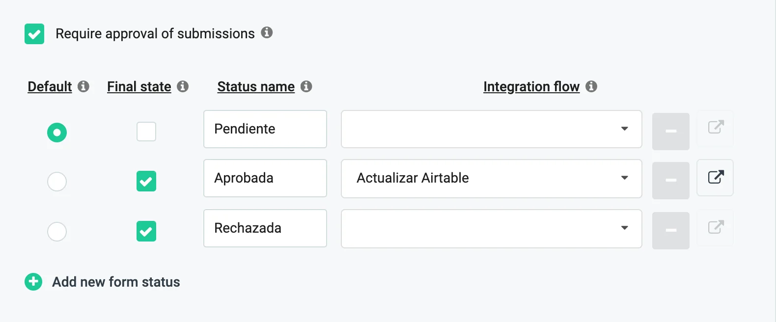 Cambia los nombres a los estados, y vincula el Integration flow que hemos creado anteriormente a el estado de Aprobada.