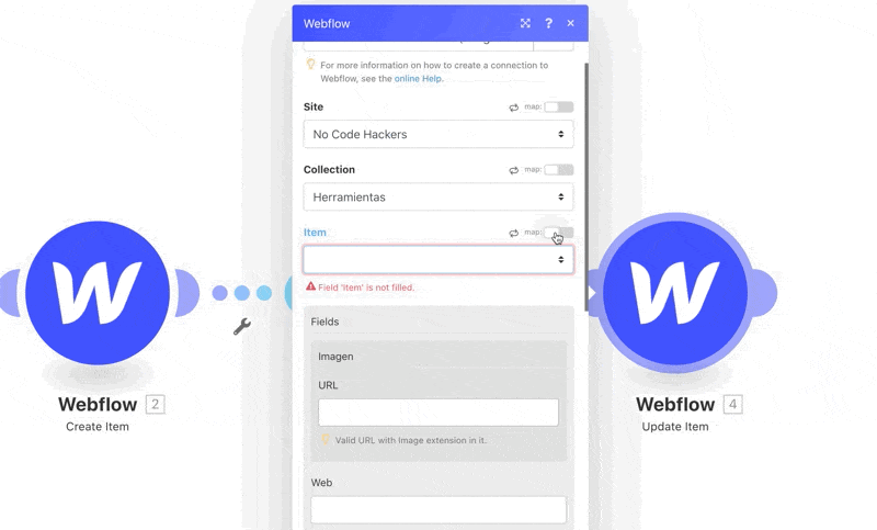Para poder actualizar el elemento, deberás activar la casilla de Map, que te permite incluir el ID del elemento (El campo Item ID, que hemos obtenido del paso 2), y navegar hasta el campo de WebflowID, en el que pondremos el mismo campo.