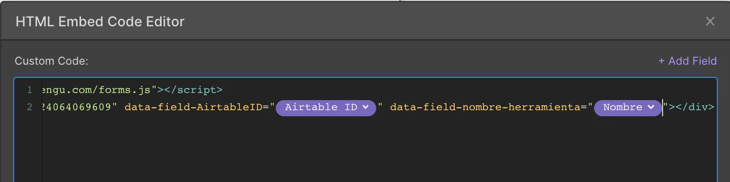 Esto lo que hará será darle un valor al campo oculto que hemos creado en Arengu. Sin embargo queremos que este valor sea variable con el Airtable ID de cada herramienta (lo que lo vincula a la información que tenemos en Airtable).