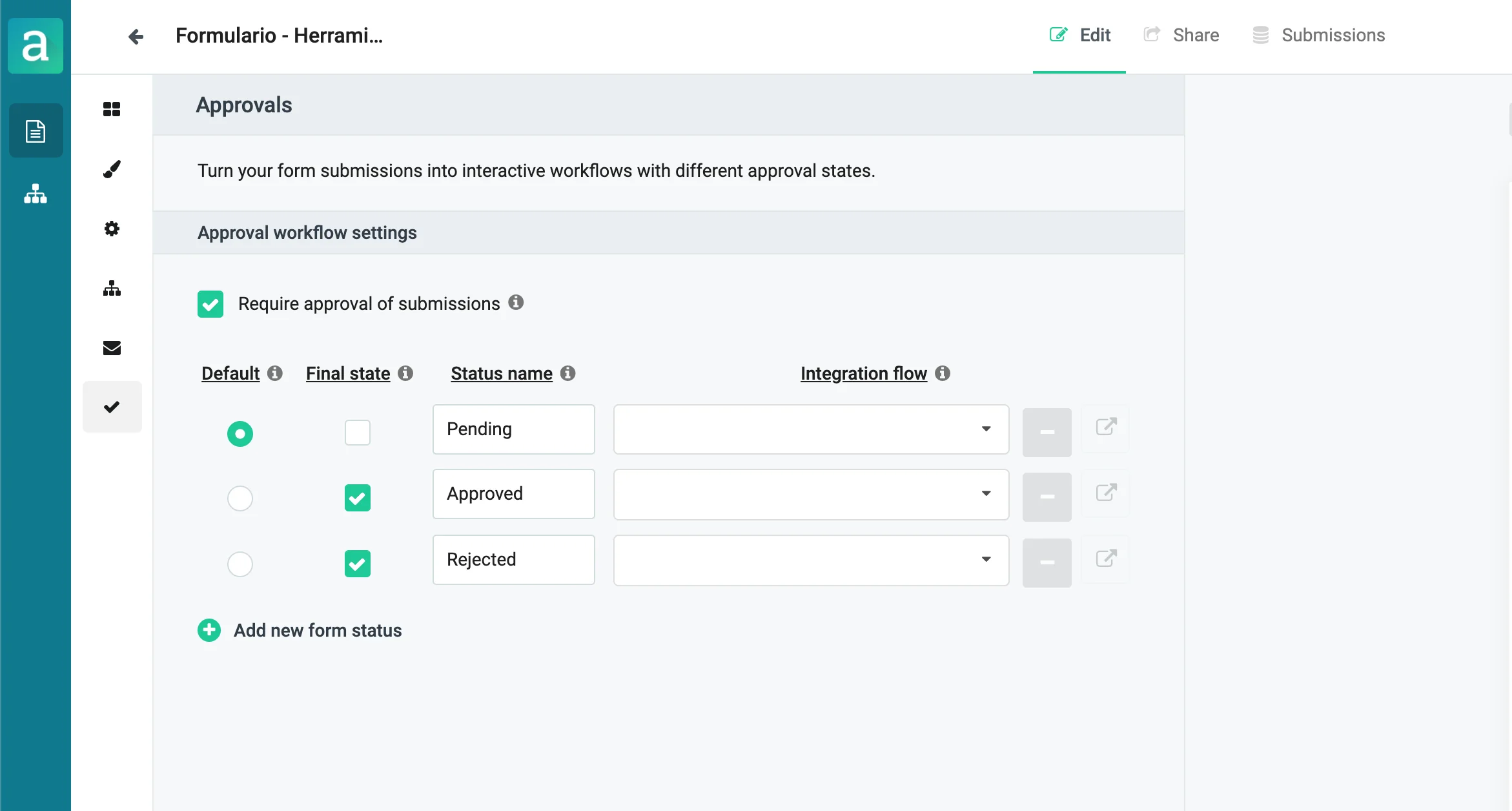 Ahora, deberás eliminar el flujo del formulario en el apartado de After submission, que es donde lo habíamos configurado anteriormente, porque si no se estará ejecutando siempre. Lo que queremos es que podamos decidir que se ejecute solo al pasar a Aprobada.
