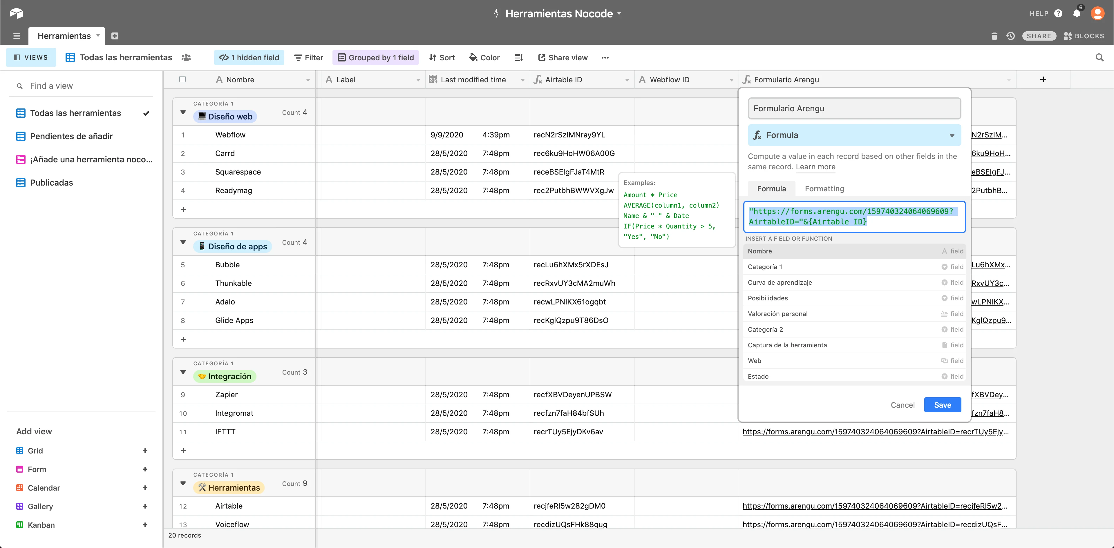 Ahora, deberás ir a Airtable y crear un nuevo campo de tipo Fórmula. Lo llamaremos Formulario Arengu.
