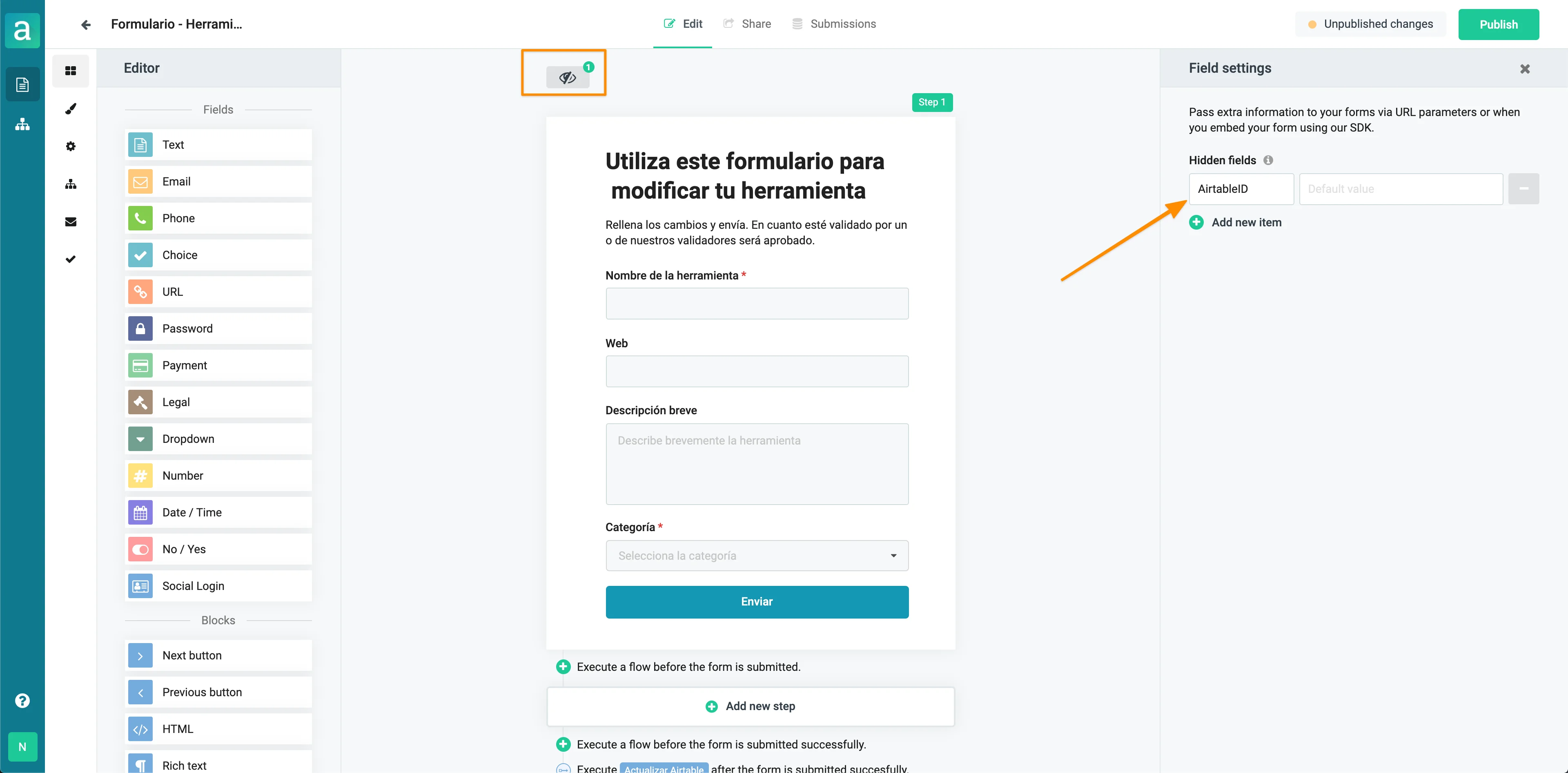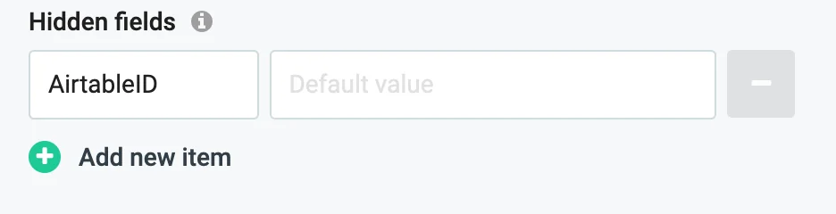 Para crearlo, simplemente hacemos click en el botón del ojo tachado, lo que nos abrirá el panel de Hidden Fields. Le daremos un campo de nombre Airtable ID y que no tenga valor por defecto.