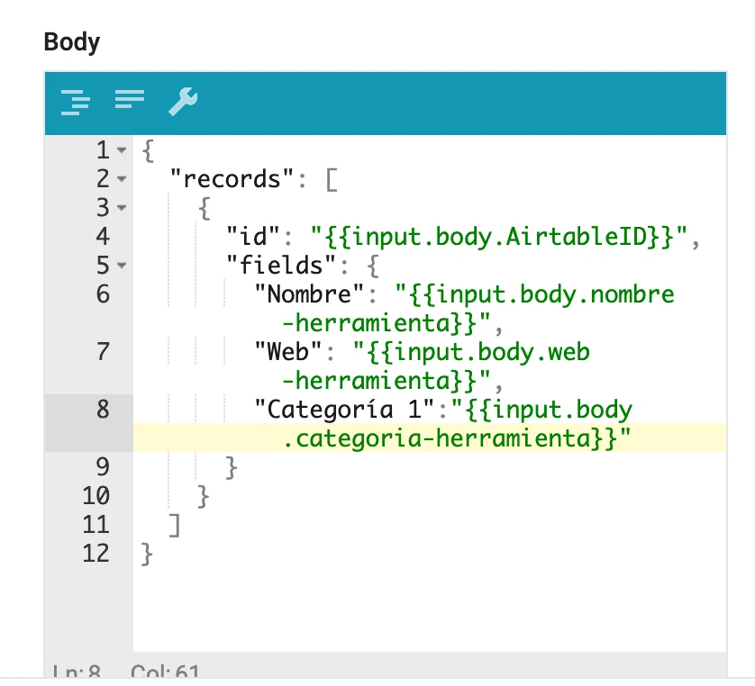 {"records": [{"id": "{{input.body.AirtableID}}","fields": {"Nombre": "{{input.body.nombre-herramienta}}","Web": "{{input.body.web-herramienta}}"}}]}