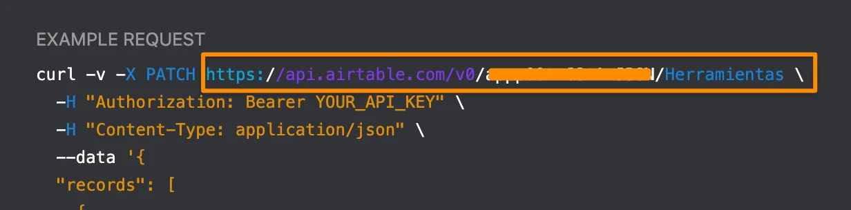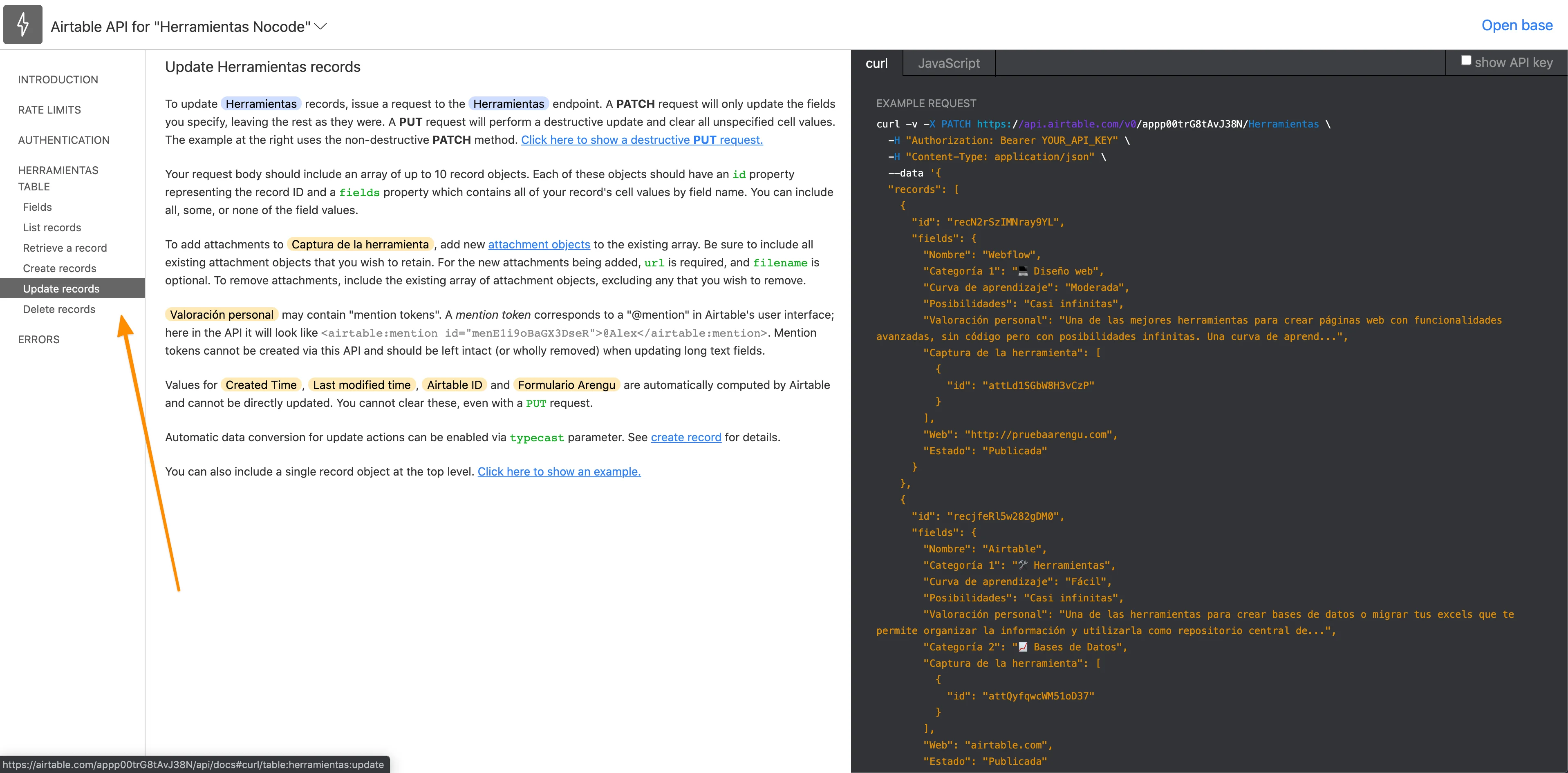 Navega hasta la sección de Update Records, y tendrás un ejemplo de la llamada que debes hacer. Si no entiendes de API, no te preocupes, que te diré lo que tienes que hacer.
