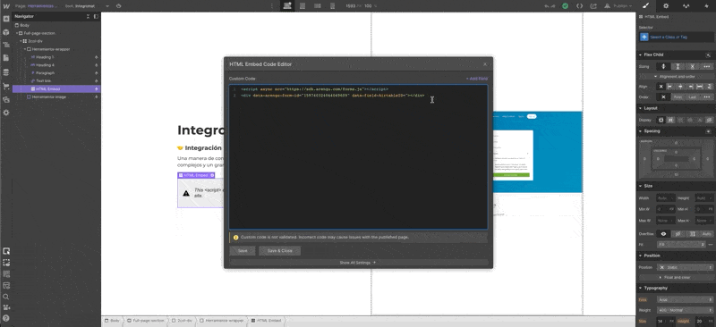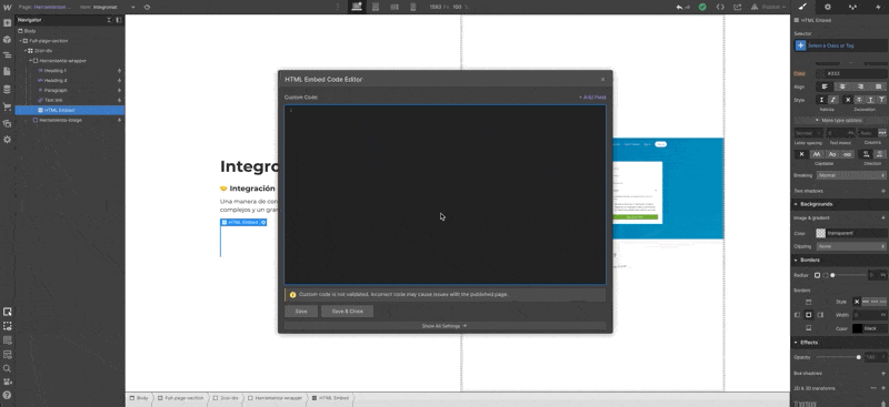 Lo primero, simplemente deberemos insertar un elemento HTML Embed, y pegar el código que encontrarás en la pestaña de Share de Arengu.