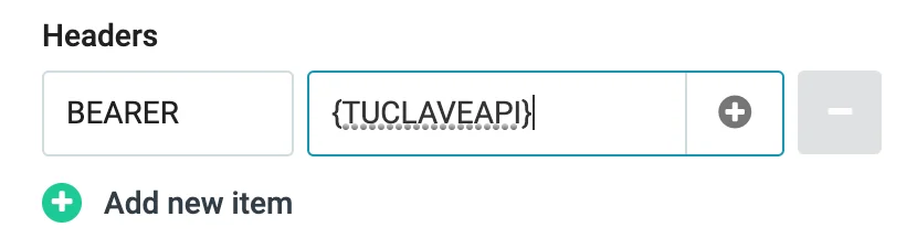 Ahora verás que pide que le pases dos parámetros: El token BEARER (Básicamente tu clave API) y que sea un contenido tipo json.