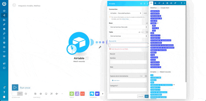 Simplemente deberemos conectar Webflow e Airtable para que cada vez que se añada un nuevo record a la tabla de Airtable, cree un "Item en Webflow".
