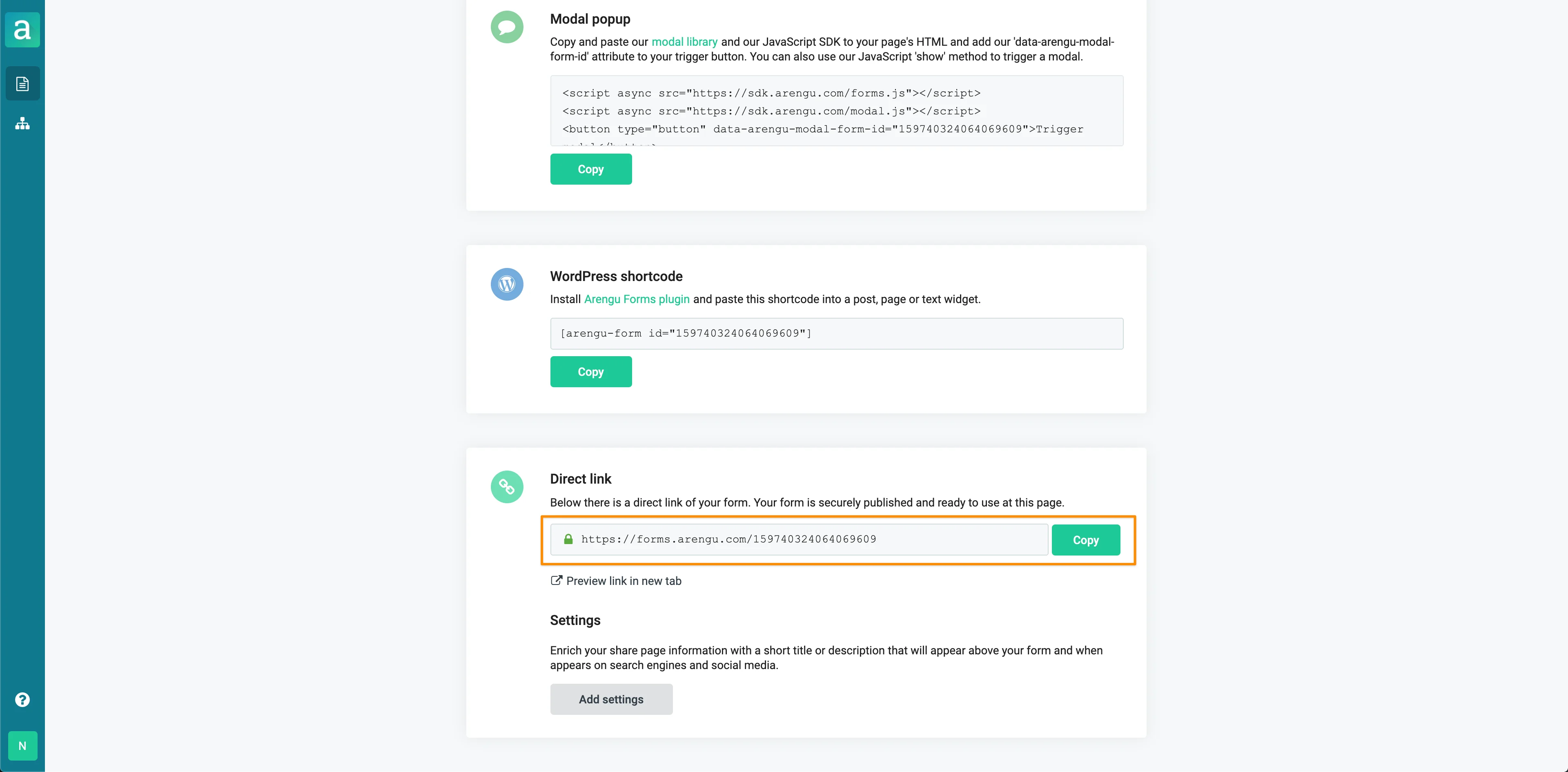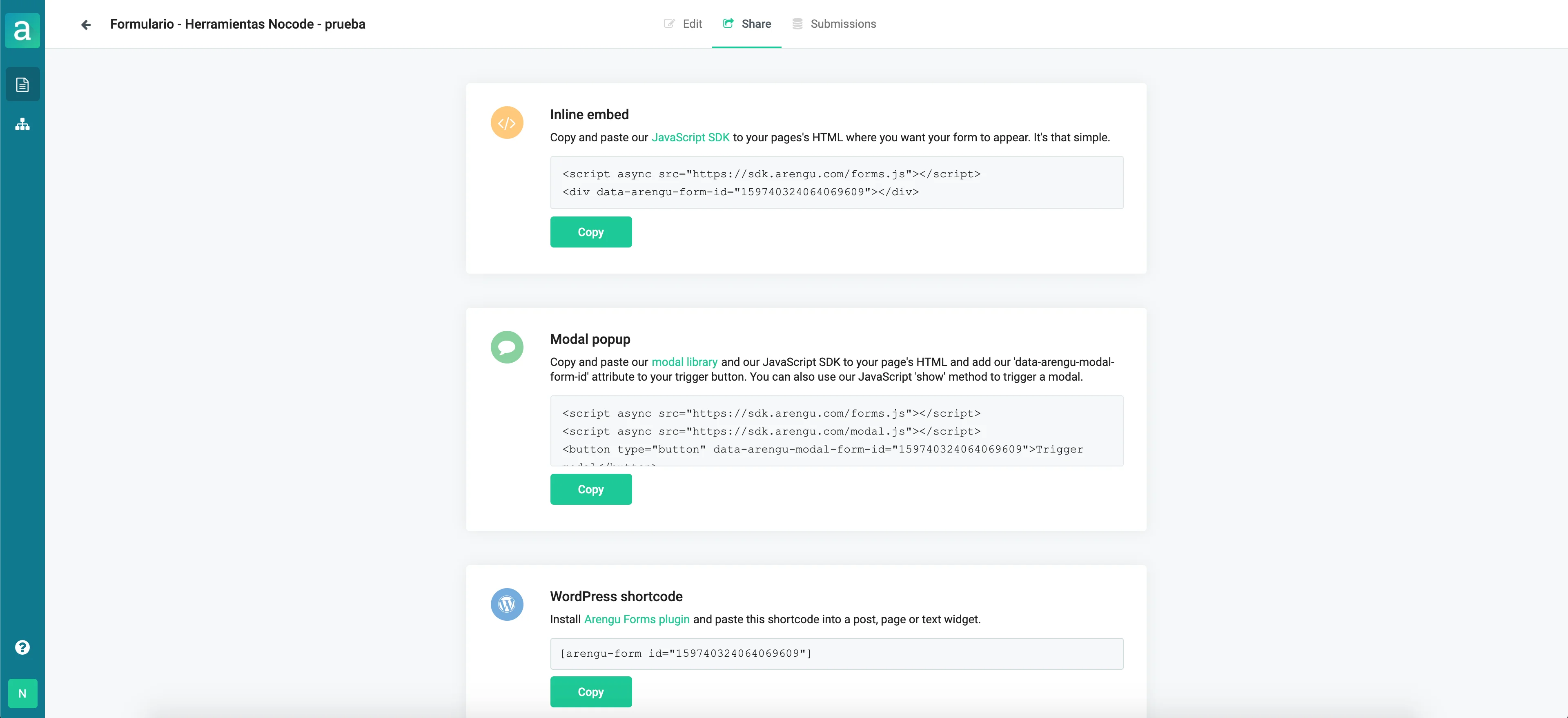 Para ello, vete a la pestaña de Share dentro de Arengu, que te permitirá obtener la URL del formulario: