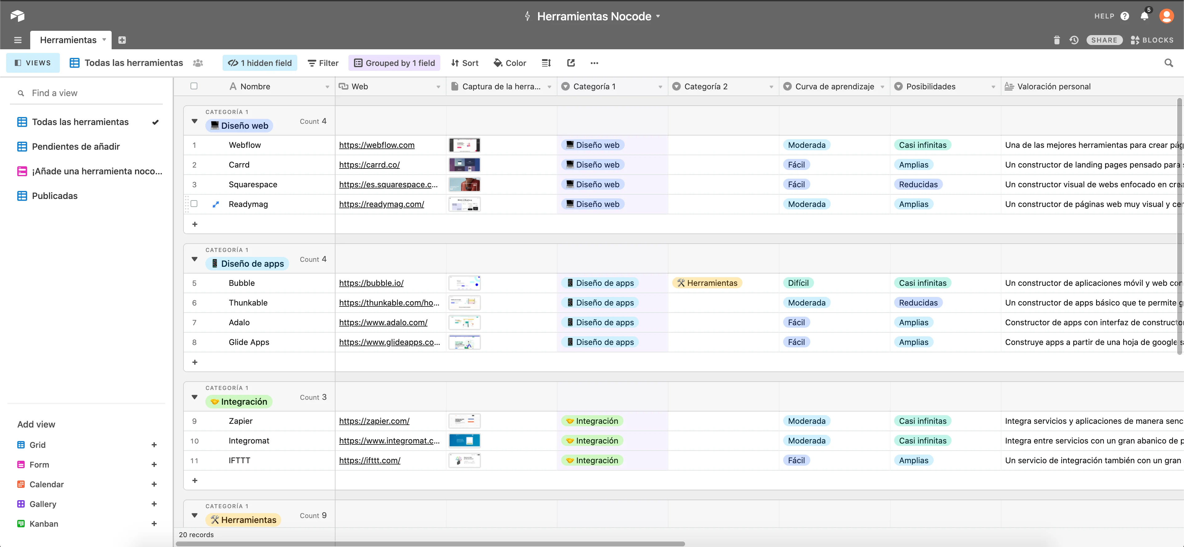 Tendremos una tabla en la que estarán todos los recursos que queramos poner en nuestra página web. En este caso, he utilizado como plantilla la colección de herramientas Nocode.