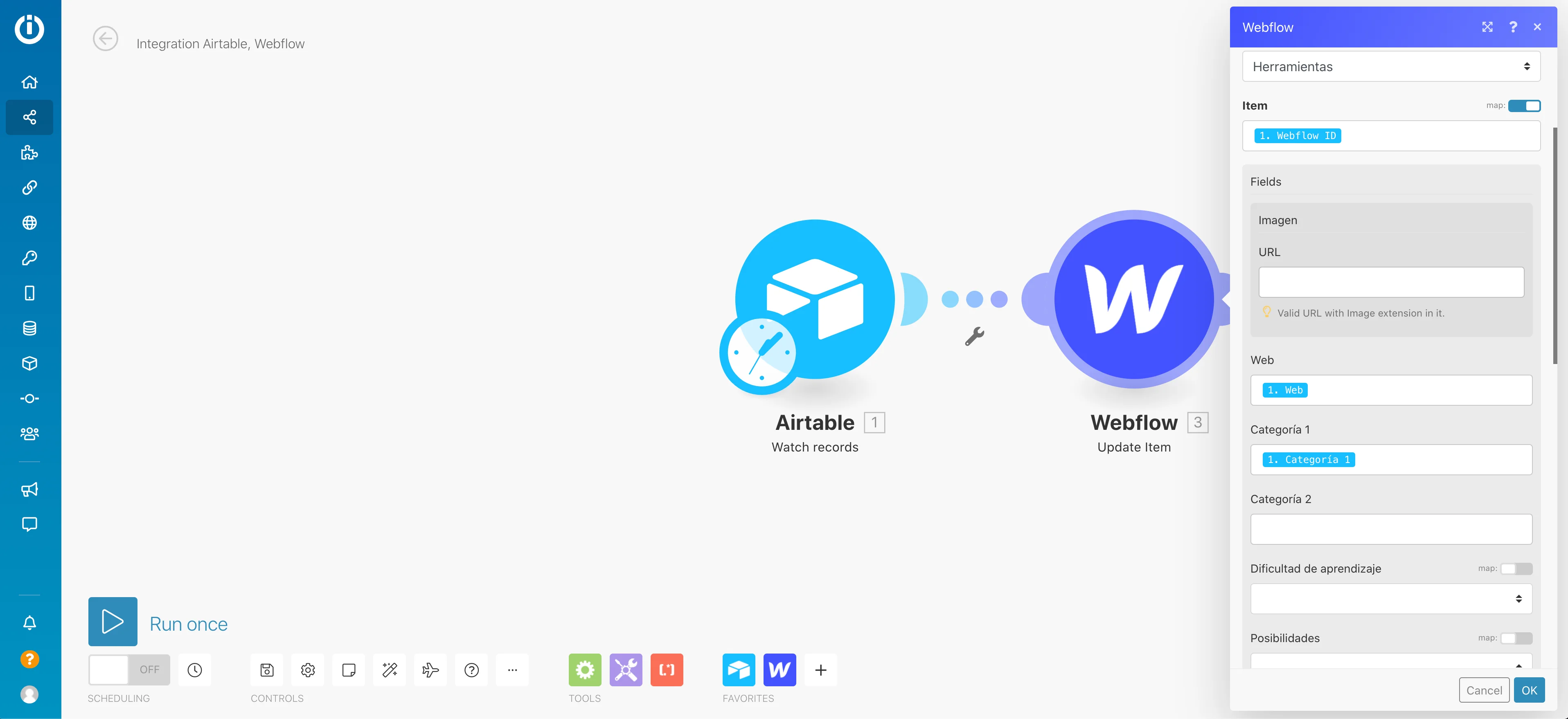 Para ello, deberemos crear dos acciones nuevas en Integromat, una que actualice Airtable, cogiendo el Airtable ID, del primer paso, y otra que actualice Webflow, cogiendo el Webflow ID, del segundo paso.