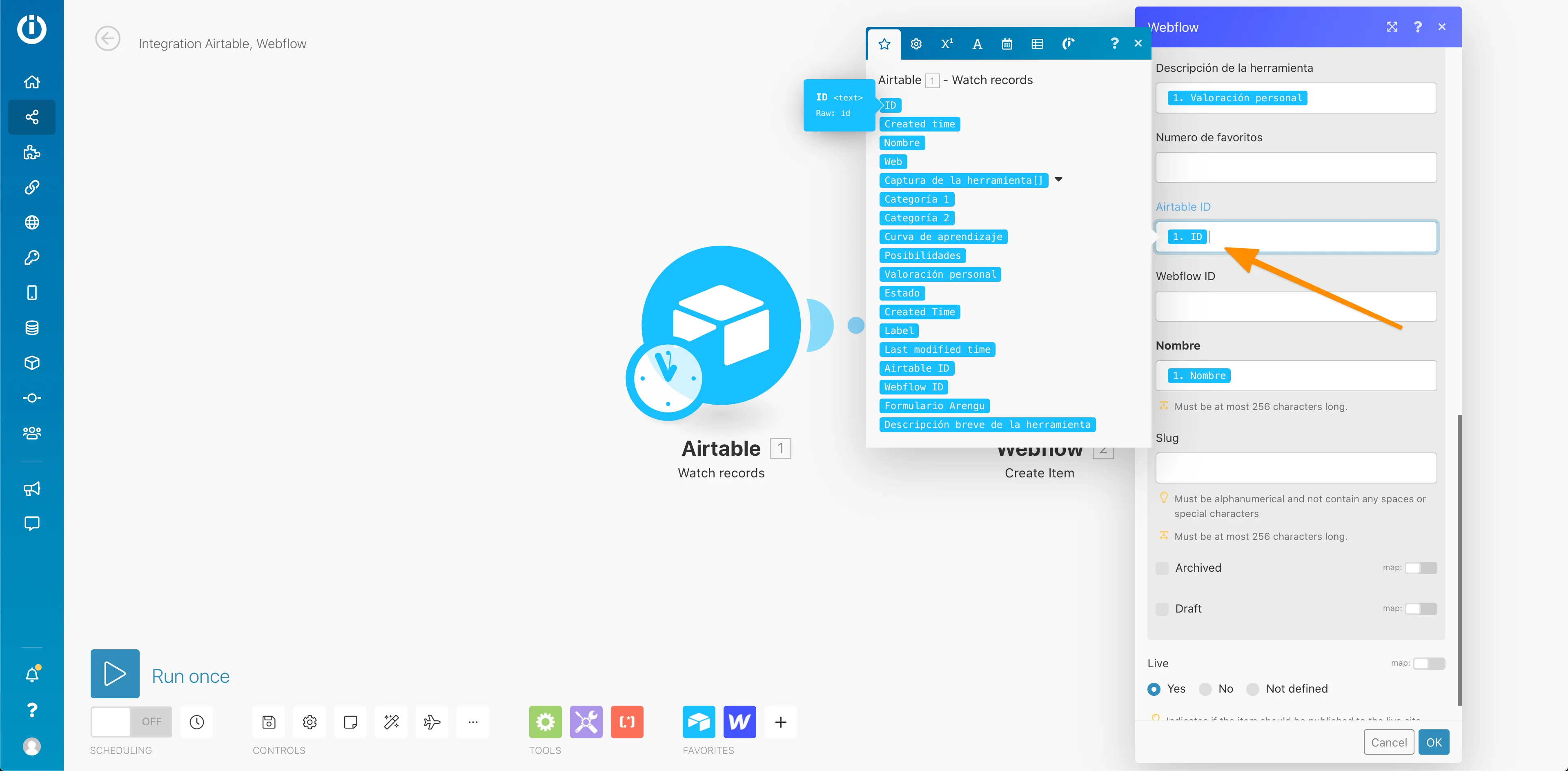 Gracias a que hemos pasado el campo de "WebflowID" a Airtable, será muy fácil vincular uno con otro.