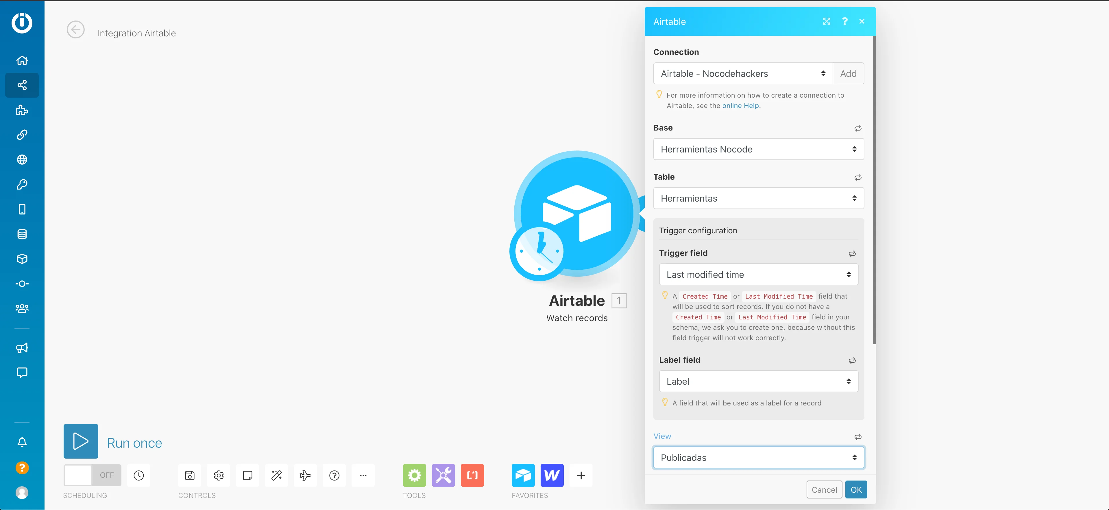 Debemos configurar como trigger: Watch Events de Airtable, ahi seleccionaremos la base, tabla y vista correspondiente, y haremos que esté pendiente al campo "Last Modified Time".