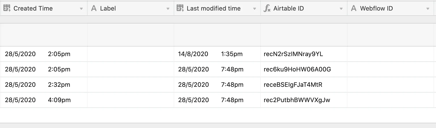 Asegúrate de que creas dos campos especiales para almacenar el Webflow ID y el Airtable ID, de formato Single Line Text.